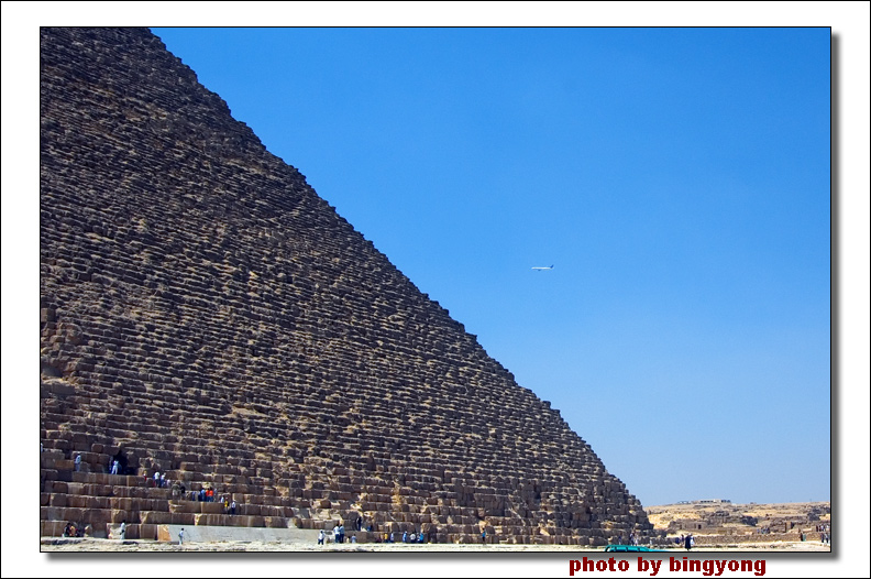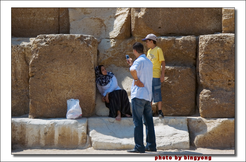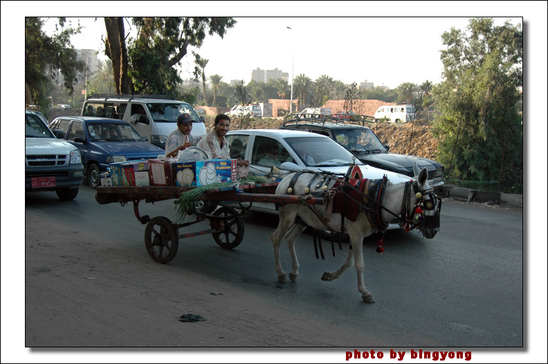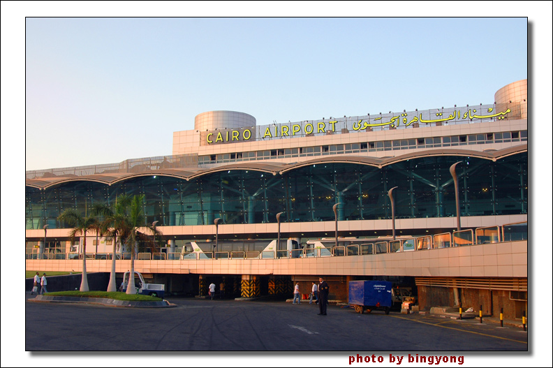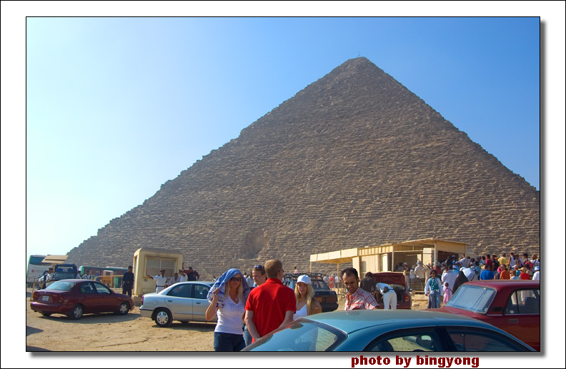 车出机场来到开罗市区,上来一位自称是我们导游的老头,他并没有像大家想象的那样带我们去商店购物,而是径直把车带到了金字塔,并为我们购买了门票。突然见到了金字塔,大家既兴奋又疑惑,匆忙拍照留念后,因不相信“天上会掉馅饼”,也怕耽误了航班,大家纷纷表示赶紧回机场,于是,来也匆匆去也匆匆地只瞟了一眼金字塔,就与它说bay-bay了。回到机场后并没有人向我们收取任何费用,感叹国内游客积累的“防宰反骗”的普遍经验到了埃及不再灵验的同时,首先对埃及形成了一个良好的第一印象。