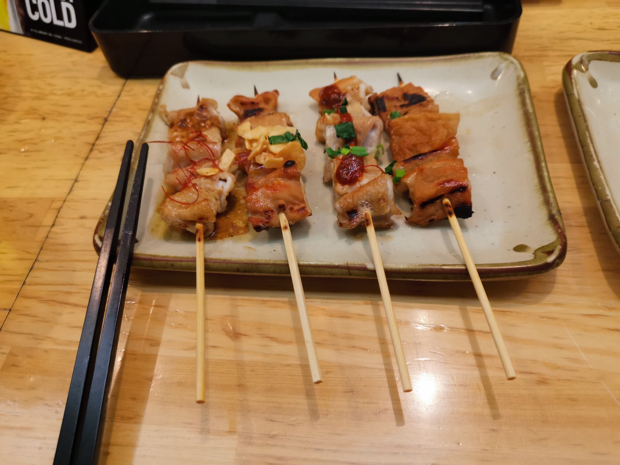 我们找了个空桌坐下,拿起菜单有点儿懵,全部都是日语完全不懂,图片就是各种看不出本来面目的烤串。推测这应该是一家喝酒撸串的居酒屋。饥肠辘辘的我们不管三七二十一,点了两个饭团,一杯啤酒,还有桌上立牌推荐的一个烤串套餐,图片看起来非常诱人。我原本对它满怀期待,没想到拿起来一尝,居然是烤大肠?!再拿一根,还是大肠!第三根,居然全部是大肠!!我一个从来不吃内脏的人儿来北海道第一餐居然就点了一套不同口味的烤大肠。。。蒜香的,番茄的,辣的。。。以后真的不能看着图片瞎点了,还是老老实实用翻译软件拍译吧。
