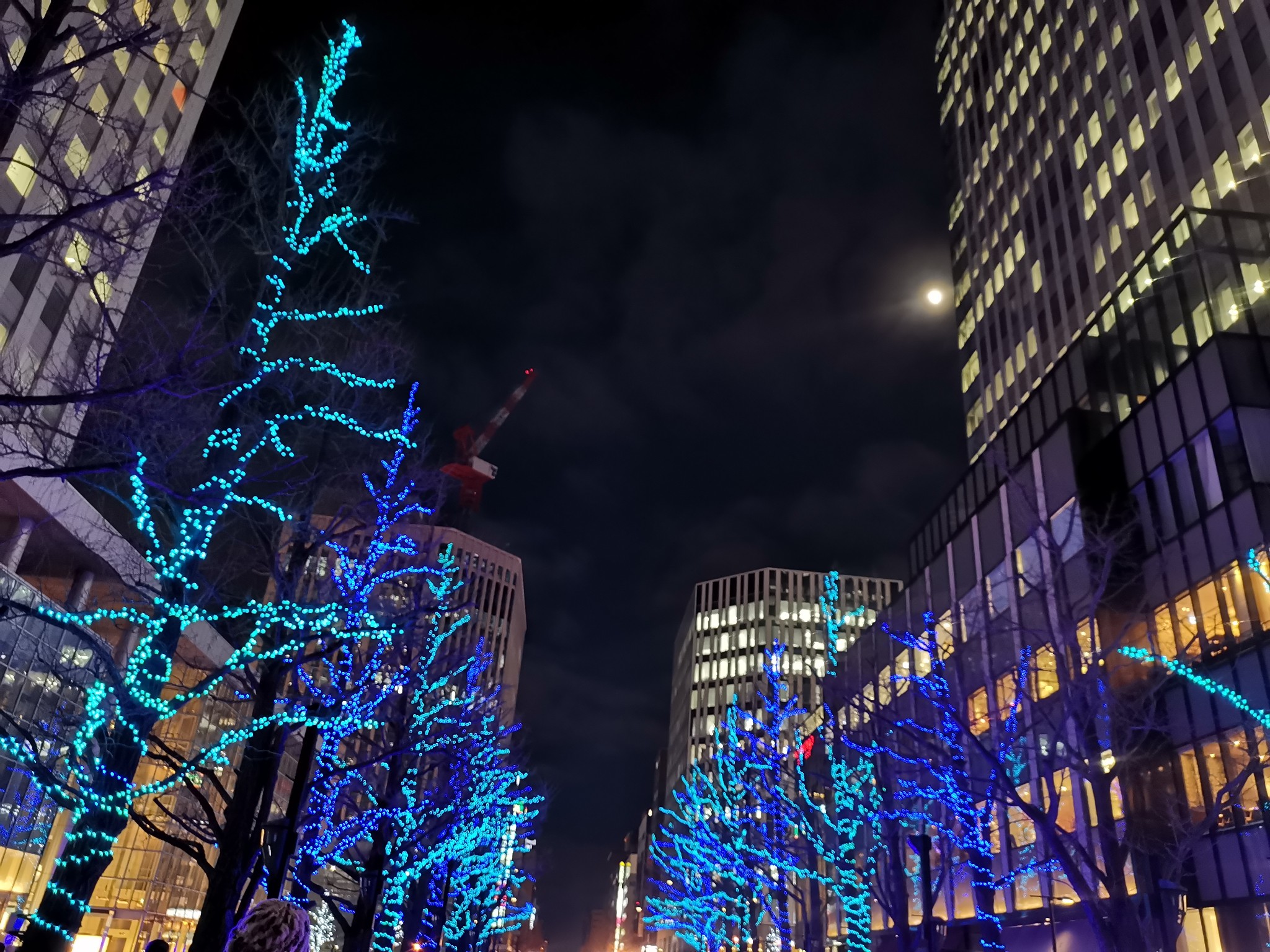 在房间休息一会儿,我们开始夜游札幌。札幌站附近离很多打卡地不远,我们开着googlemap一路导航,可是不知道为什么导航有些问题,老是变换方向变换路线,兜兜转转去了北海道旧市政厅,大通公园,费了好大劲找到了大众点评推荐的一家餐厅,到了门口挂着一块牌子,老板有事,当天暂停营业,我和GQ已经是又累又饿又冷,筋疲力尽了。看到附近一家串鸟店,立刻钻了进去找吃的。这家店门外看起来很冷清,进了门口顺着楼梯走到地下一层,嚯,里面热火朝天,满满的都是喝酒聊天的人,而且目测大部分都是日本当地人。