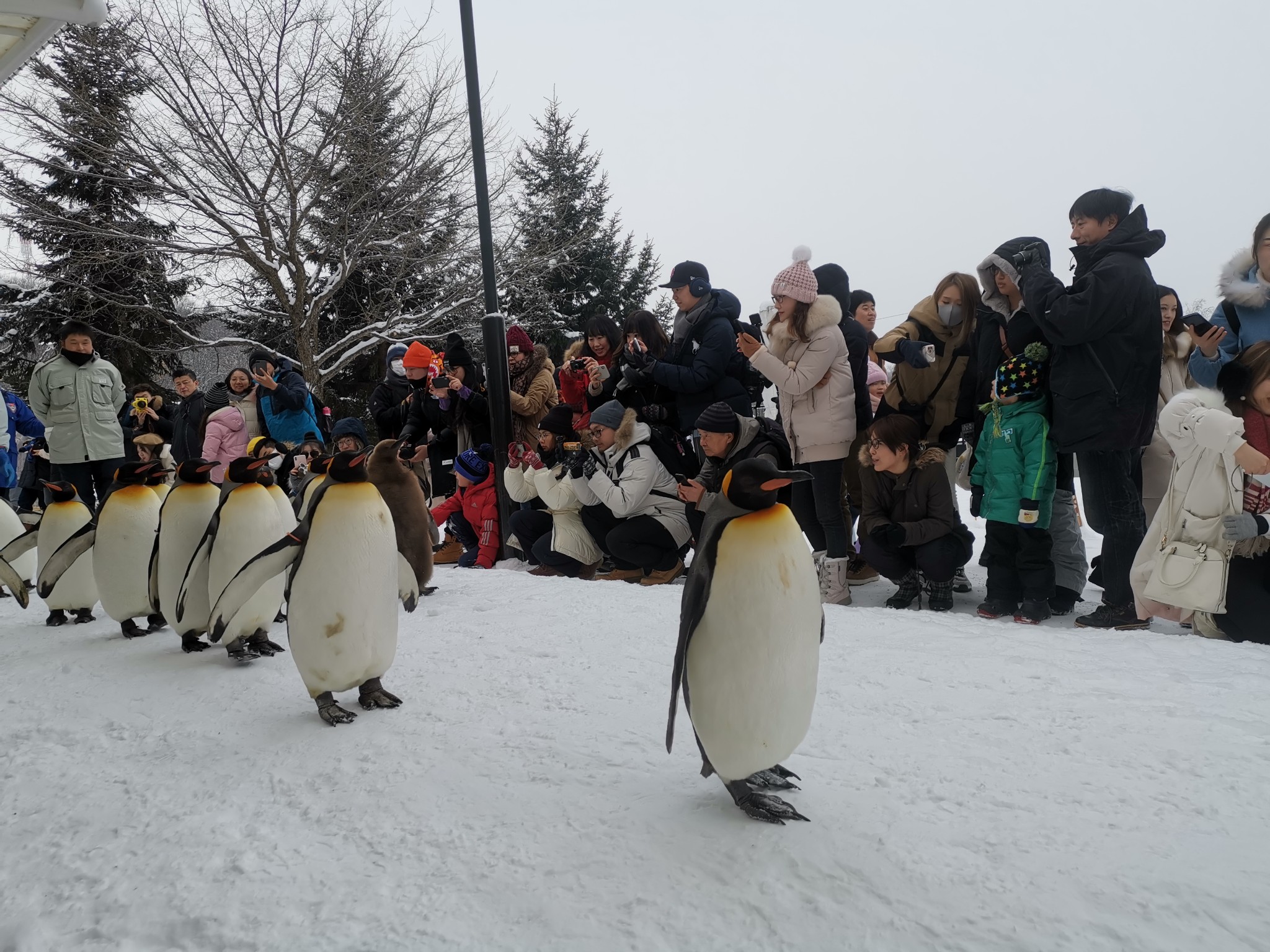 旭山动物园最有名的当然是企鹅漫步,一进动物园人们都跑到了企鹅漫步路线旁,虽然正式的漫步要到11点才开始,但是由于企鹅们人气爆棚,如果不提前找好位置,是很难近距离观察企鹅的。十点多,路线旁已经站满了人,端着相机焦急又兴奋地等着,那场景像极了期待明星走红毯的粉丝和记者。小企鹅们一出来,红毯的那一头便传来欢呼,这一头的人便伸长了脖子,举起相机随时准备开拍。那一摇一摆慢悠悠的小家伙们,浑身的毛油亮亮的非常可爱,尤其是其中一只没长大的棕色“猕猴桃”,毛茸茸的大憨憨,好想揉一揉抱一抱。