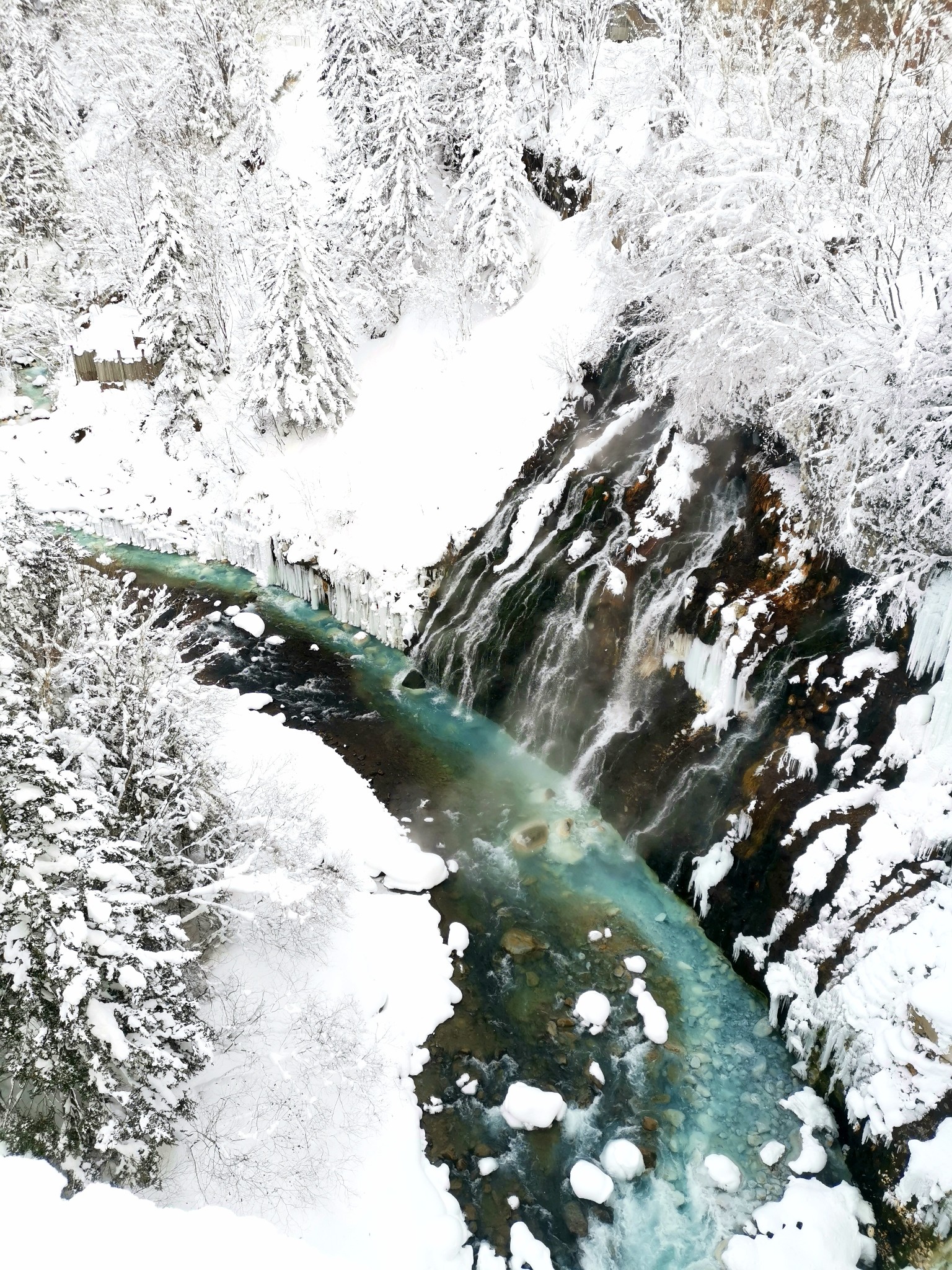 逛完网红树,我们还去了清池,因为下了大雪,清池已经结了冰变成一块平平无奇的大冰坨,没有导游指点我们根本看不出什么,匆匆瞥了一眼便前往下一站——白须瀑布。在此之前,我已经被网上的流传的照片吸引,对它充满了期待,真实的白须瀑布真的有图片上那么美吗?不会是卖家秀与买家秀的巨大落差吧?真正到了那里,一颗心才落了下来。漫天大雪里,一步步走到桥上,看白色的瀑布从布满雪松的山涧倾泻而下,飞瀑撞击着潭水中的石块,哗哗的响声不绝于耳。低头俯瞰桥下,一弯碧绿澄澈的溪水向着远处静静流淌。身临其境的感受远比图片来得震撼,动中有静,意外地和谐,有声又似无声,让人心静,来日本两次看到的风景总是给我这样的感受。