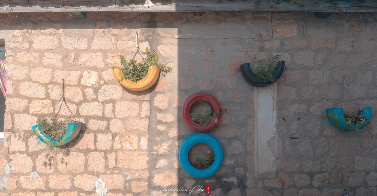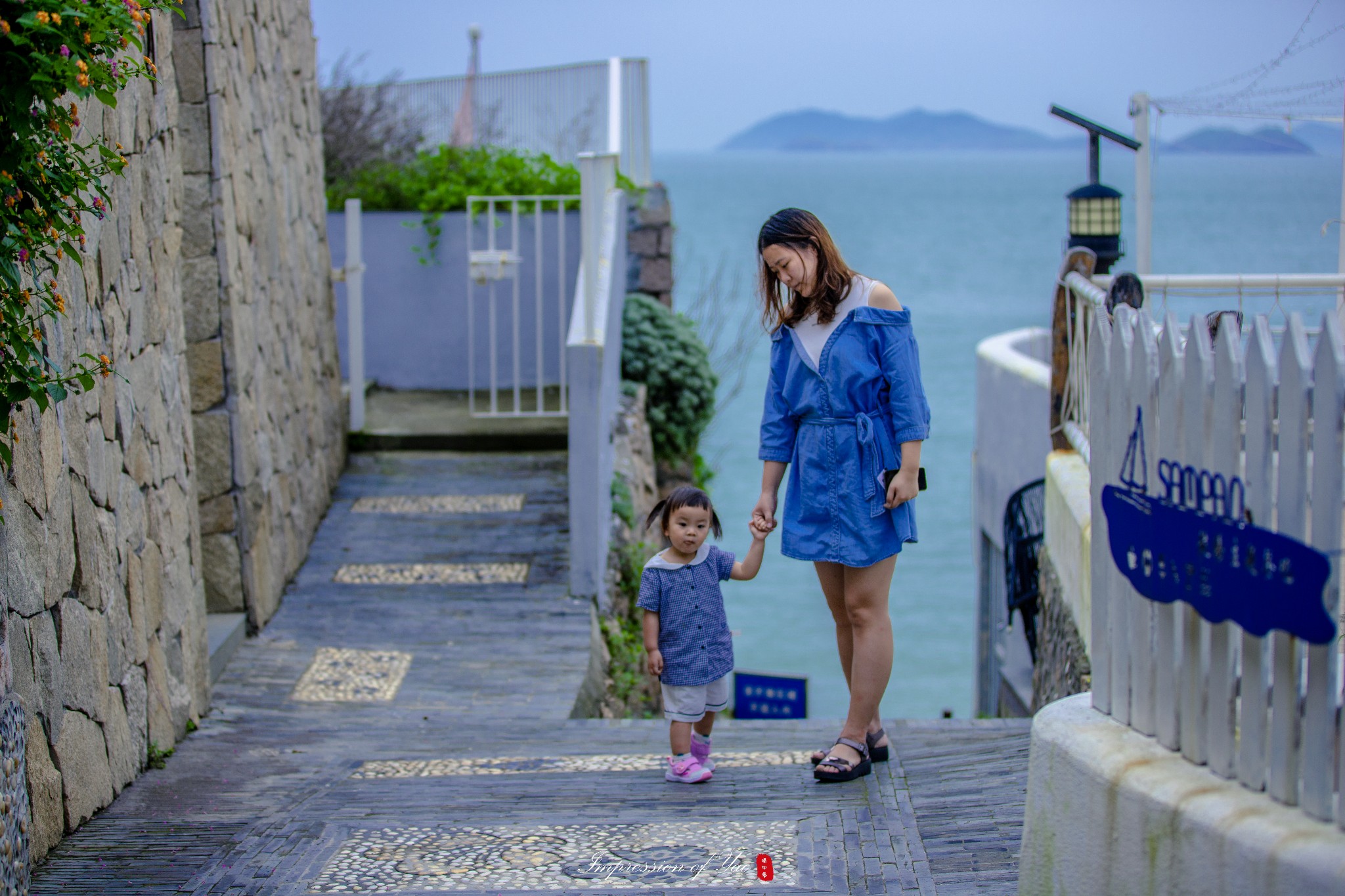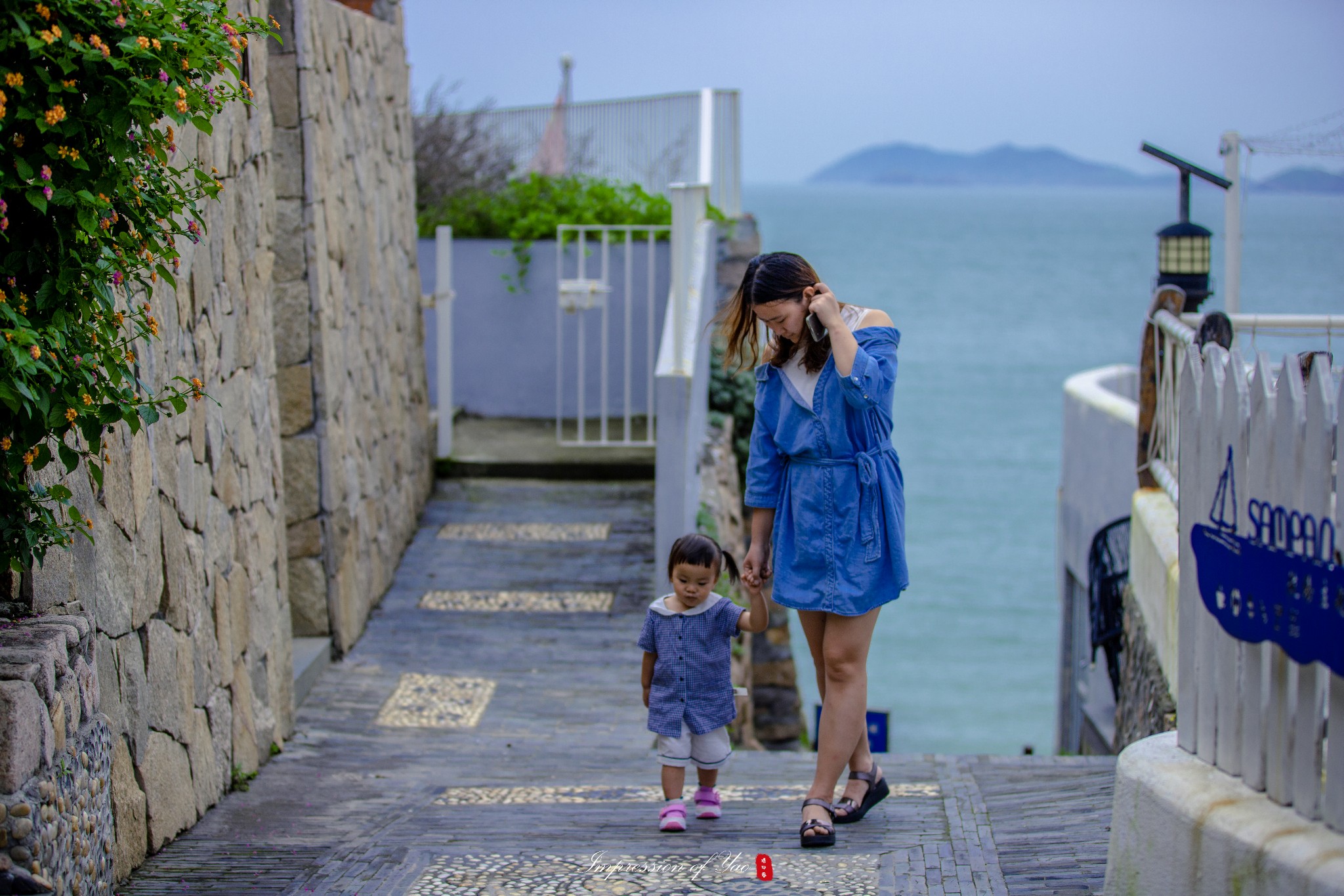 这里每一个小巷都是惊喜,远处淡蓝色的海水提供了天然的背景,石砖砌成的墙壁,蓝白相间的色彩,四处点缀着不同色彩的小花。路边的电线杆之间,电线纵横交错。有了电线的天空,有一种错乱的美感,这在杭州似乎已是很少遇见。这也是很日系。
