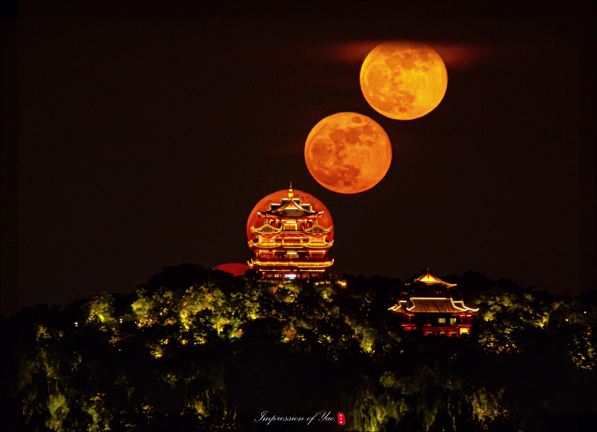 飞机、血月和城隍阁在这个瞬间定格在一起,仿佛贯穿古今。