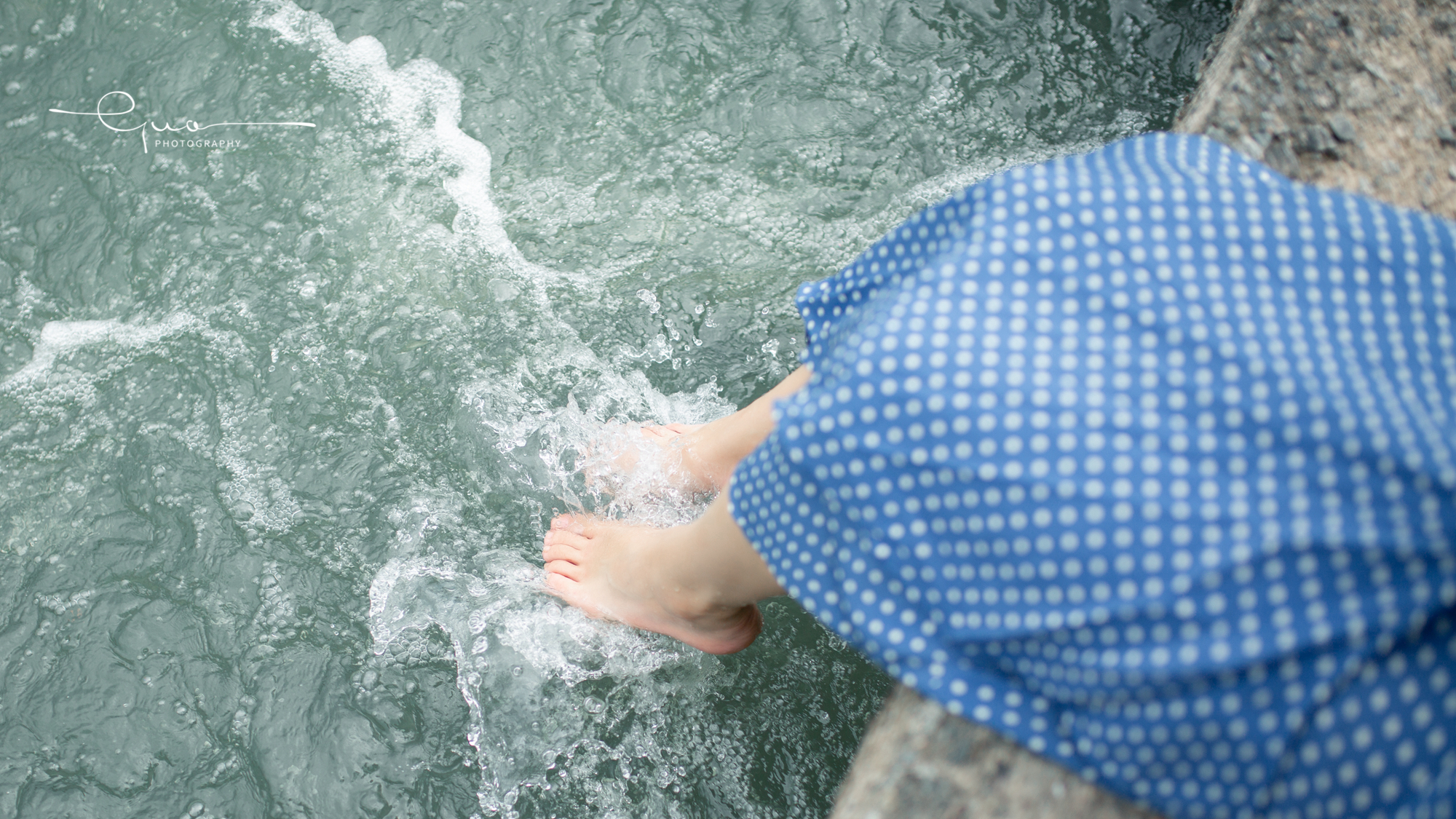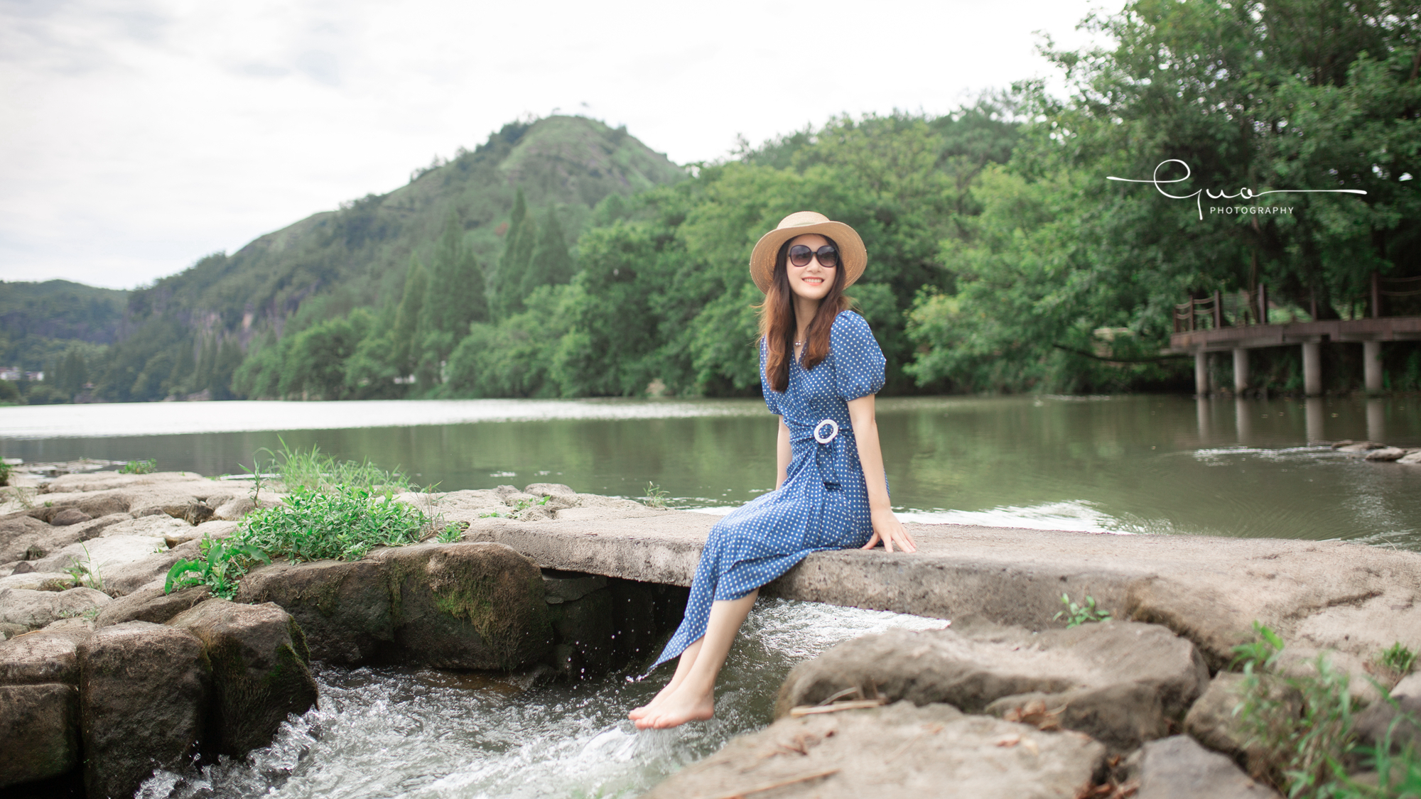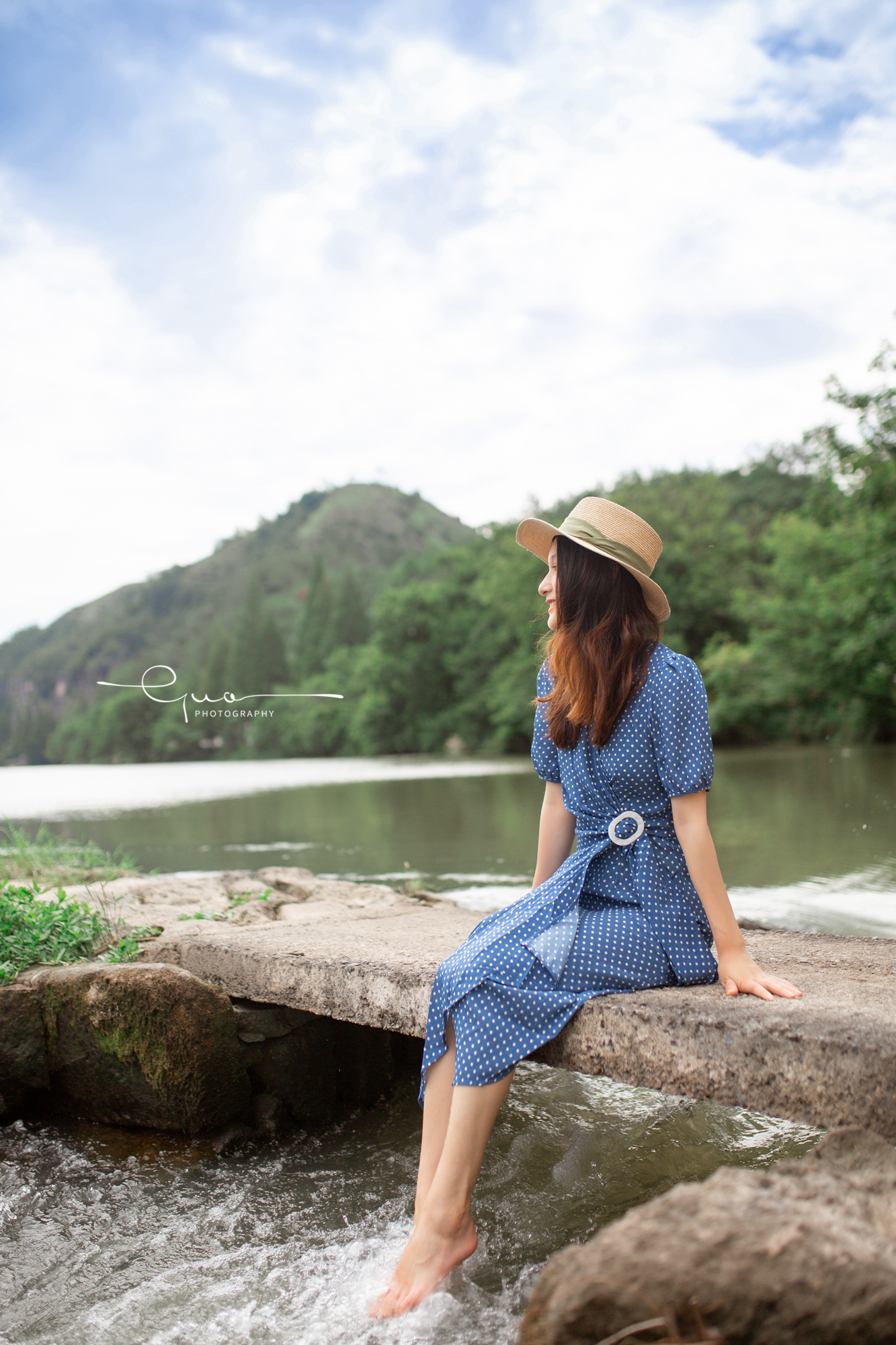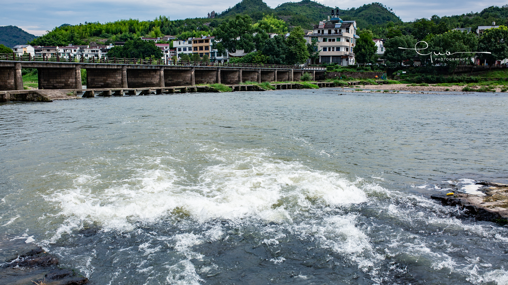 穿过一座桥,看到一泉溪水,水流很急,坐在石板桥上,可以感受到水流湍急和泉水的清凉。