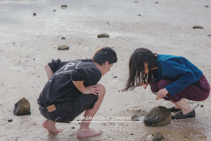 ▼ 活泼可爱的澳洲小哥指导我怎么去寻觅小螃蟹的身影,秘诀就是翻开滩涂上的石块