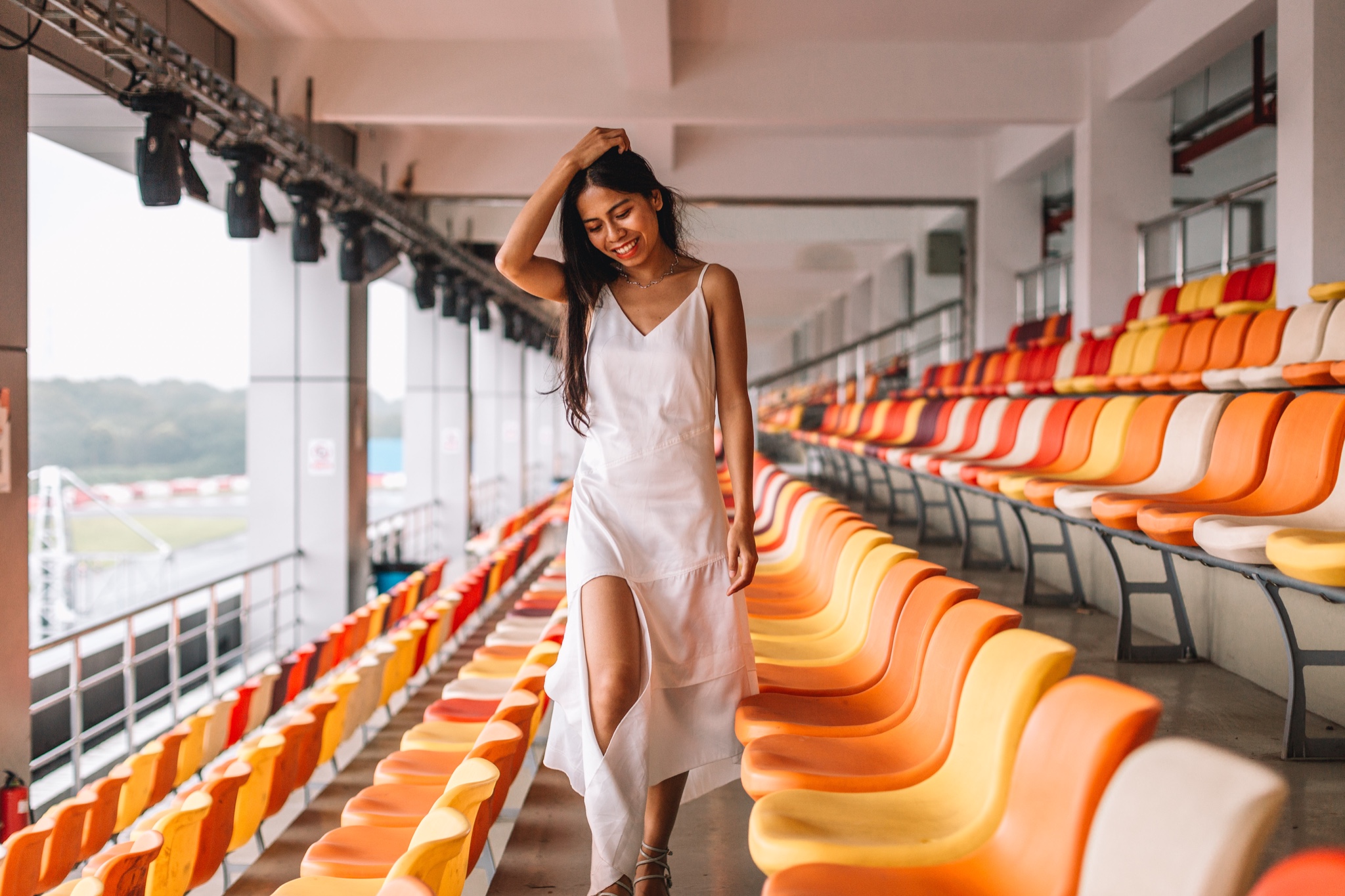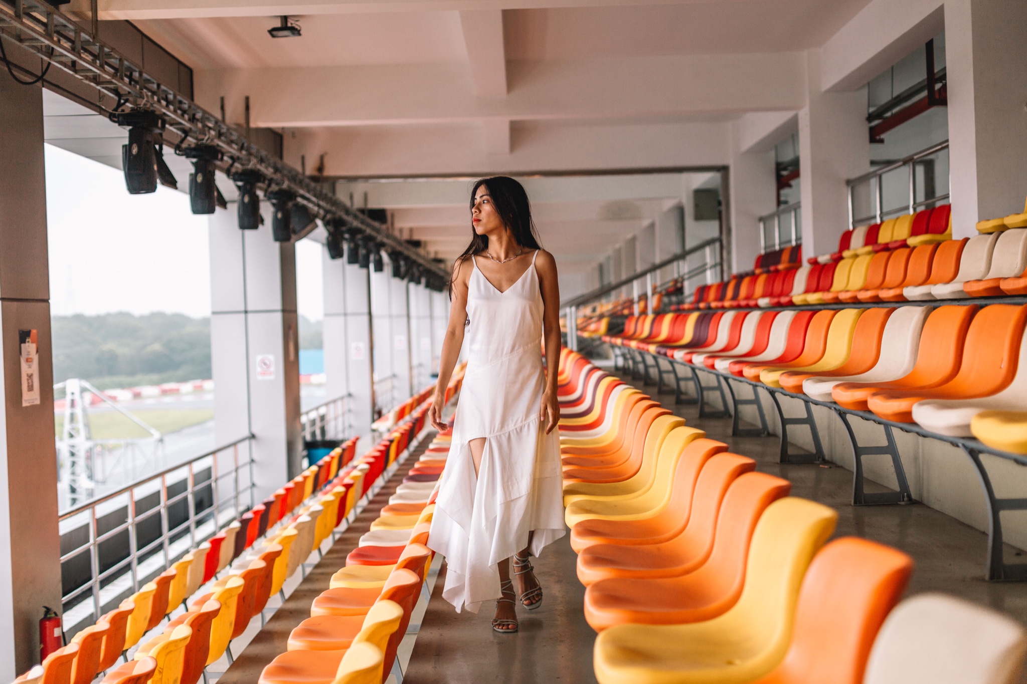 我们在雨中到达这里,正好碰上了当天周末的一个比赛,我们来的时候比较早,就跑到看台去等候,这里没有什么人看到这些黄白相间的椅子,果然创造一篇,让好朋友给我拍了几张赛车场的青春照片。