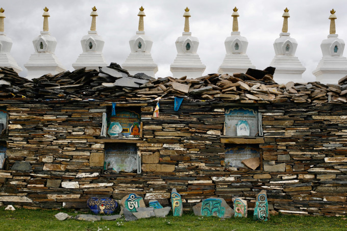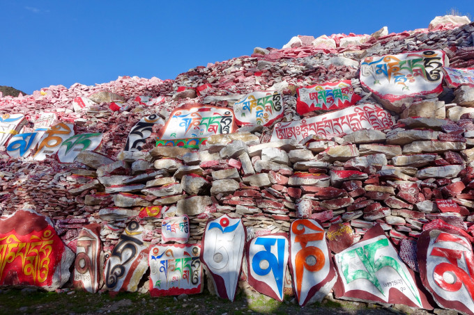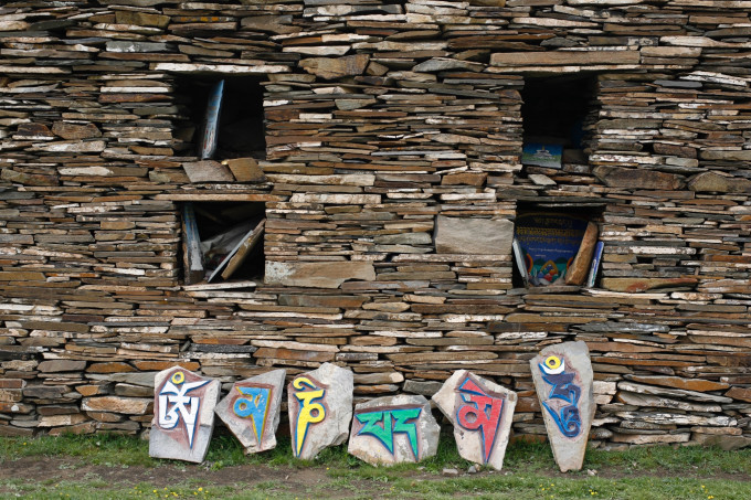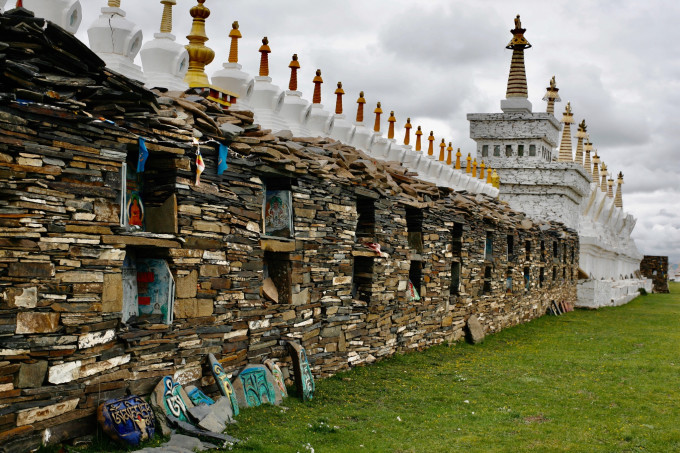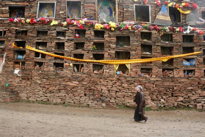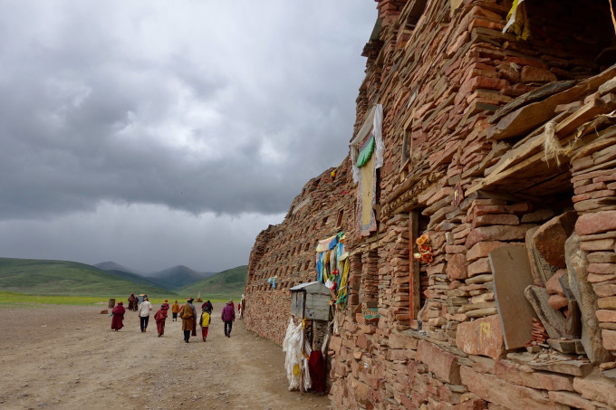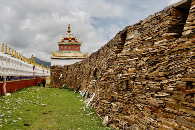 世界上最长的石经墙(巴格玛尼墙),如同石筑巨龙在扎溪卡草原上绵延伸展: