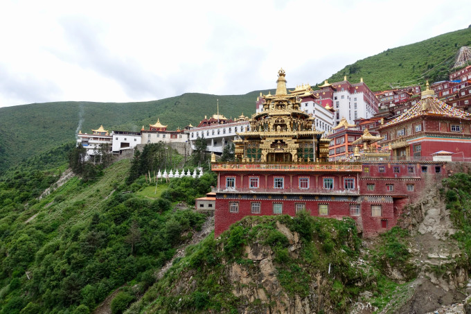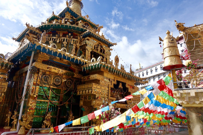 位于高山之巅的噶陀寺,金色的坛城威严伫立: