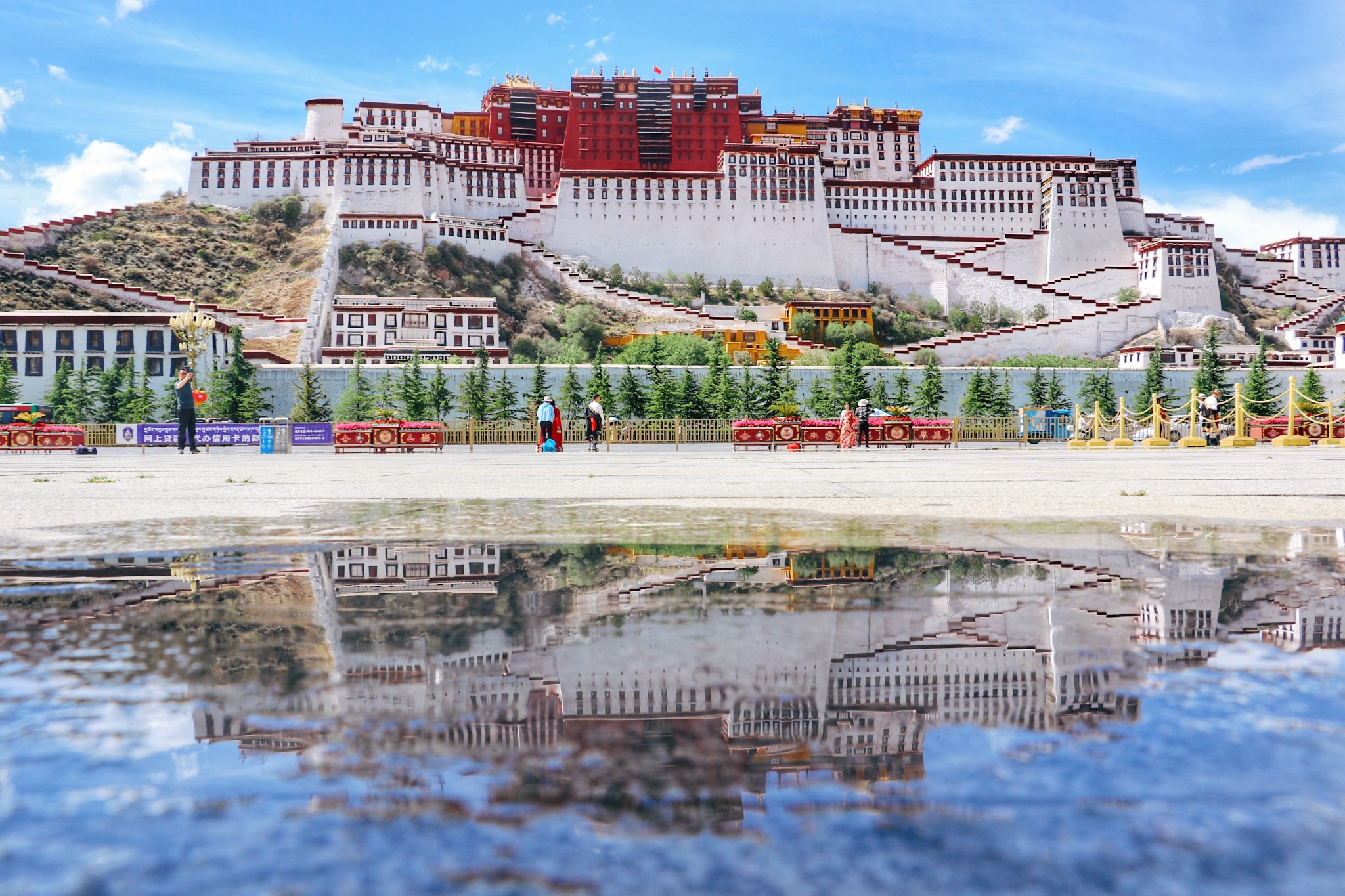 都说布达拉宫广场是拍摄布达拉宫倒影的最佳机位,但想在阳光明媚的布达拉宫广场邂逅一片尚未干涸的小水潭是何等的难,我们决定自己带两瓶矿泉水自己制作水潭,再用“虔诚”的姿势趴在地上拍照,不禁感慨,摄影师每一张美照呈现的背后都是如此来之不易的。