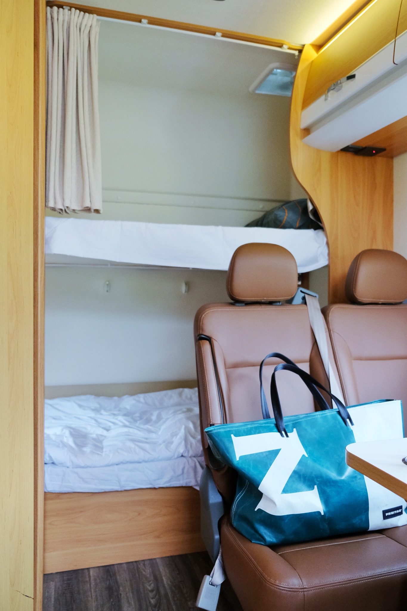 这款车型有两种选择,一种后面的床是上下铺,另一种是一张大的双人床,原本担心爸妈上下不方便,想选双人床的,但他们都喜欢上下铺款,因为中间吃饭活动的空间会更大。