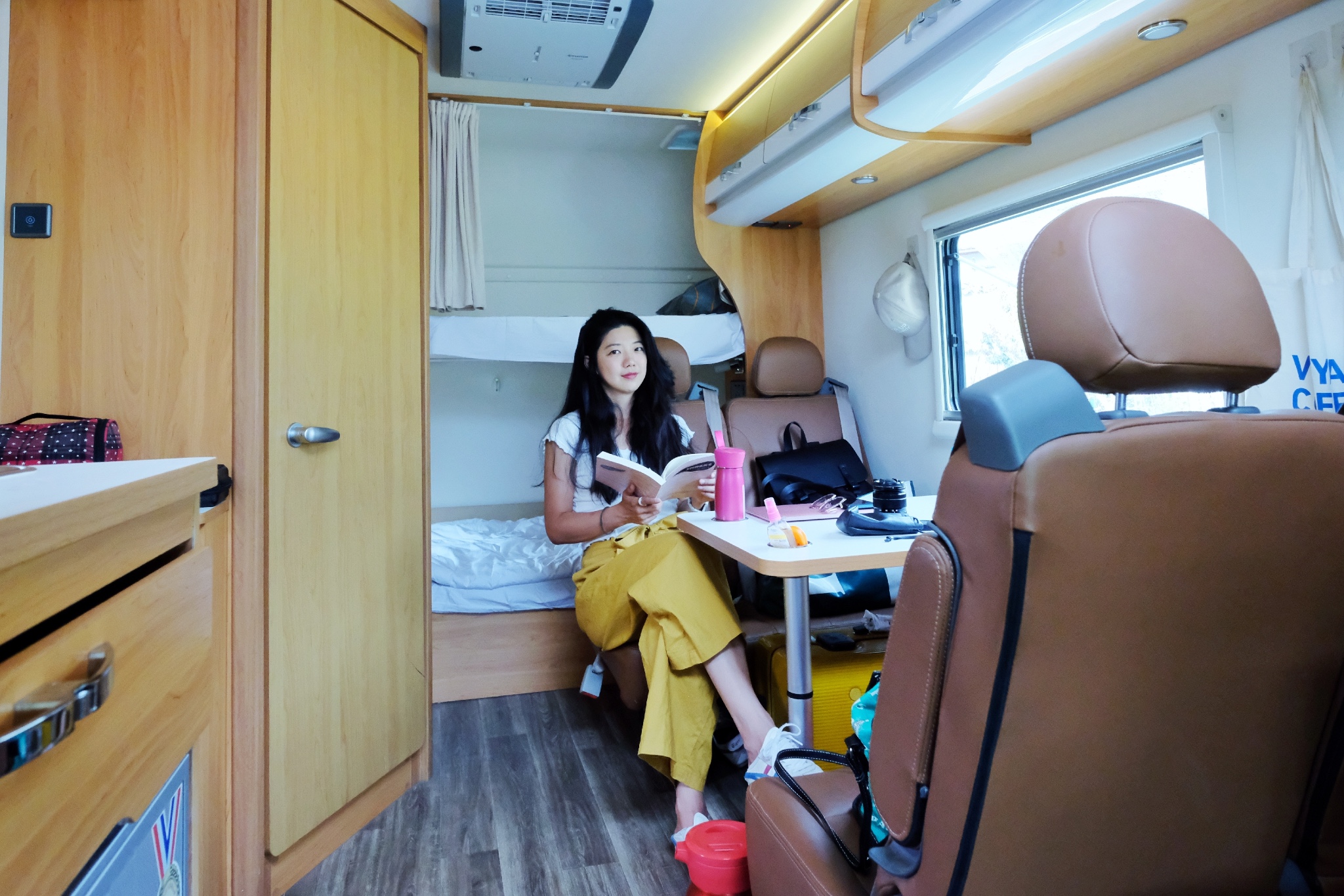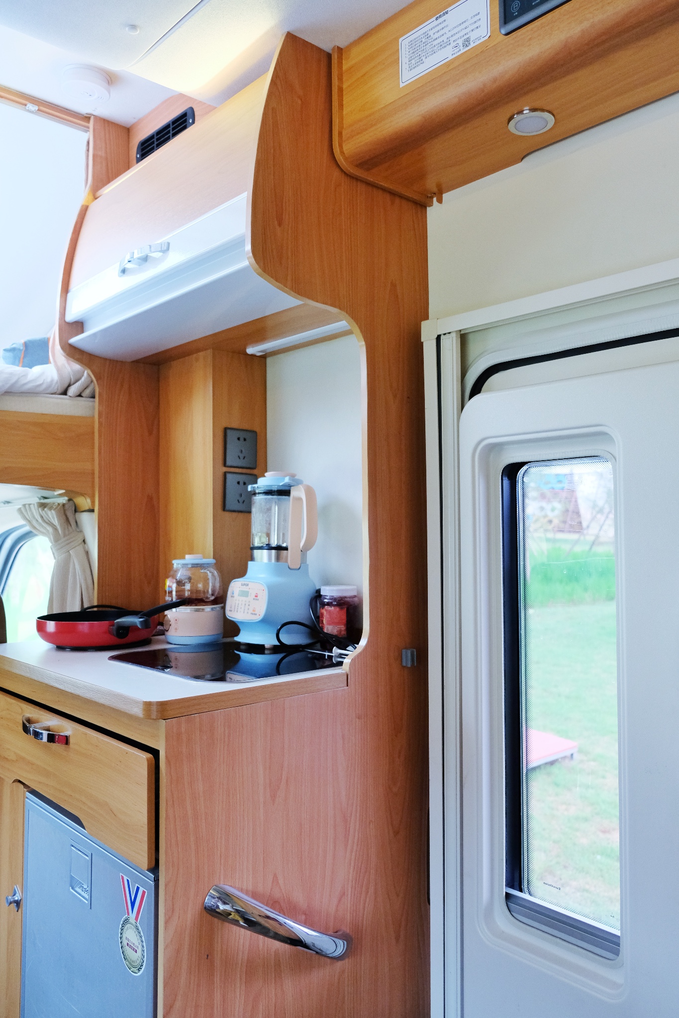 头顶一圈是储物柜,下铺下方,桌椅下方也都可以放东西。原本担心我们带的东西太多,房车会装不下,实际上都不是问题,房车的储物能力实在太强了。