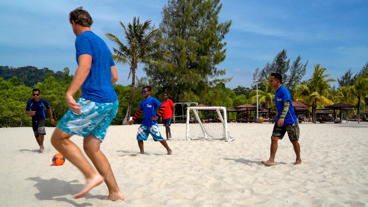 沙滩是亲子同乐的好去处,有了家长的参与,孩子们更有动力。平时我们在度假村内不乏看到三口之家在沙滩上的温馨玩耍的场景,整个沙滩都回荡孩子的银铃般的笑声。家庭成员众多的朋友可组队进行5人制的沙滩足球赤足对抗赛,比起传统足球,沙滩足球赛更有趣味,场面更加激烈。