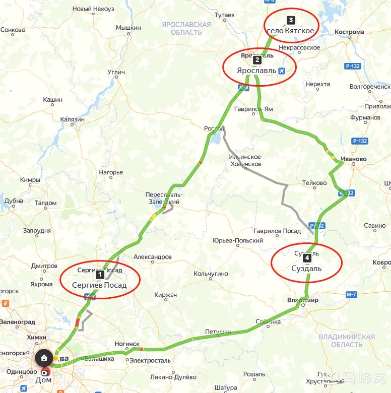 在金环我们走的路线如下:莫斯科Москва-谢尔盖耶夫镇Сергиев Посад-雅罗斯拉夫Ярославь-最美村庄Вятское-苏兹达尔Суздаль