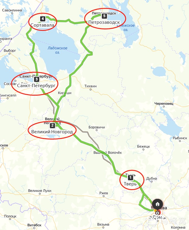莫斯科北上我们走的路线如下:特维尔Тверь-大诺夫哥罗德Великий Новгород-圣彼得堡Санкт-Петербург-卡累利阿共和国Карелия(索尔塔瓦拉Сортавала、彼得罗扎沃茨克Петрозаводск、基日岛Кижи)