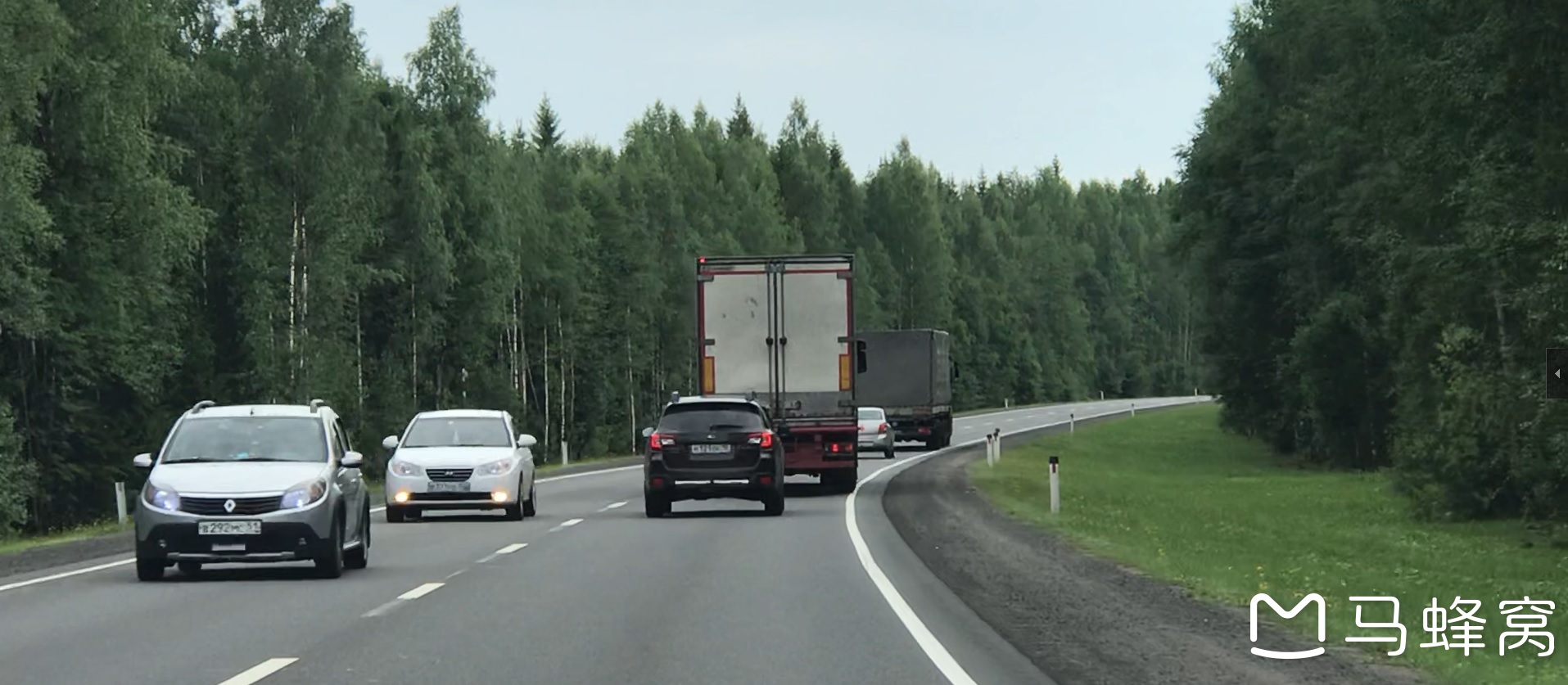 我们走不收费的公路(类似中国的国道),除了极少路段会因为货车跑得多,缺少维护所以有些坑,基本都是修得笔直平坦的柏油路。“国道”限速90,但是超速20码以内是没有问题的,超过20-40码会罚款500卢布(50元),所以保持100多码开是没有问题的,也不会颠簸。往金环去的路两边一般都是高大白桦树,经常会穿过成片的森林,而卡累利阿那边是松树的原始森林,的不得不说自驾游还是挺舒服自在的。另外,远离市区的公路一般都是双向两车道,就是去一车道,对向一车道,俄罗斯的公路还是挺多大货车的,如果遇到大货车在一段转弯比较多或者上下坡比较多的路段就无法超车了,你就不得不跟着大货车走,远看就像一辆大货车后面跟着一群小兄弟或者一队大货车像大象散步一样。