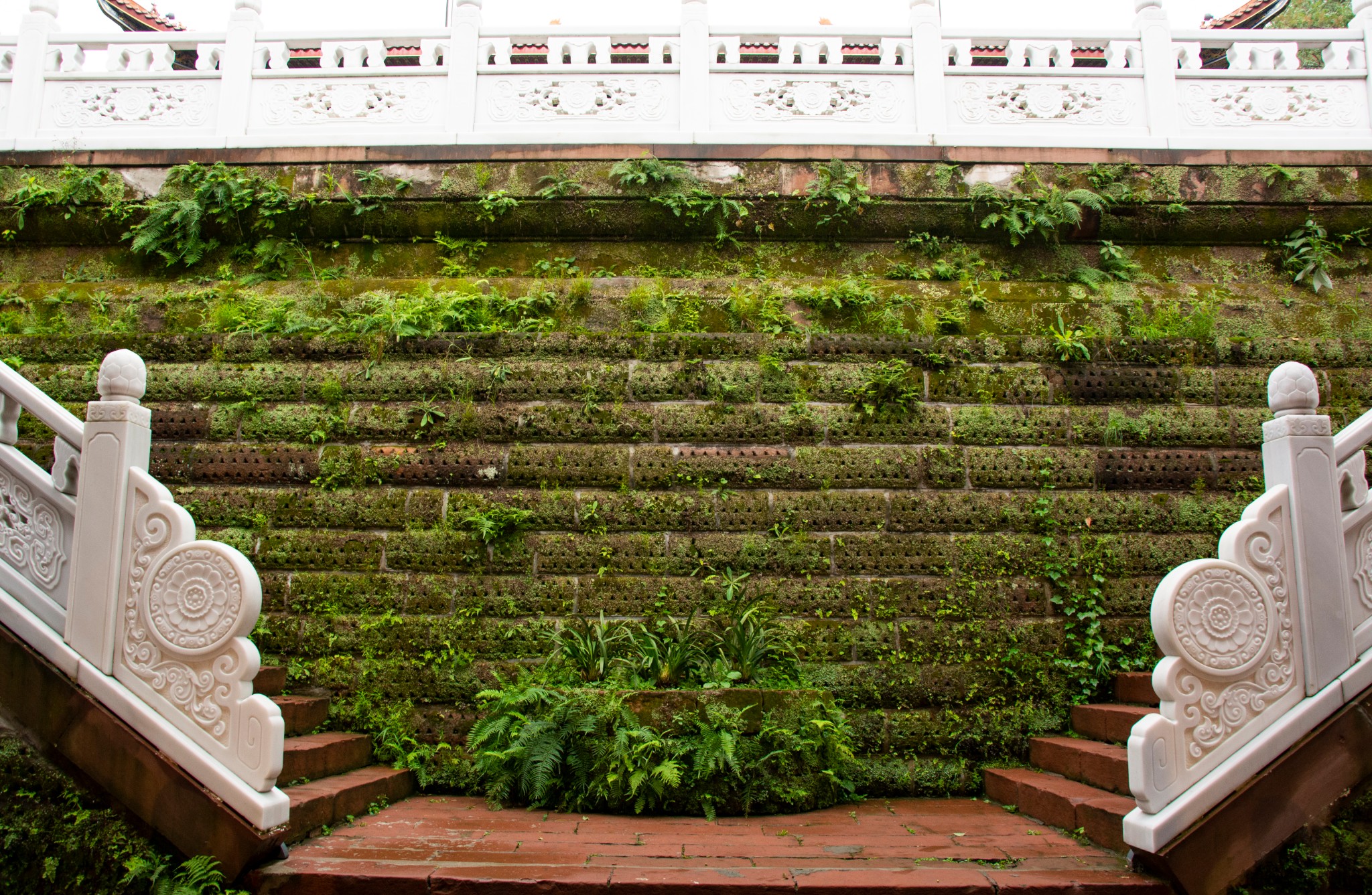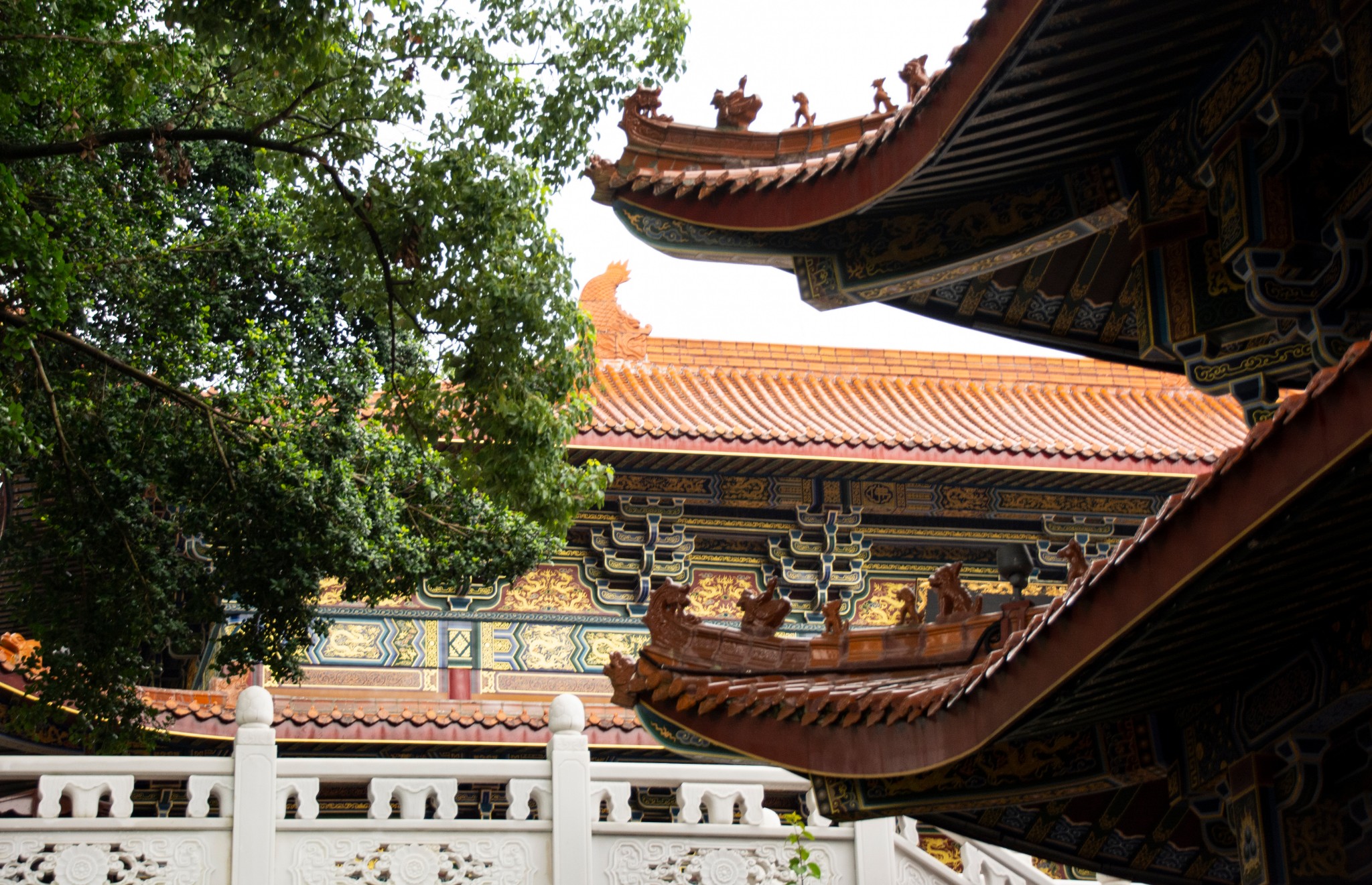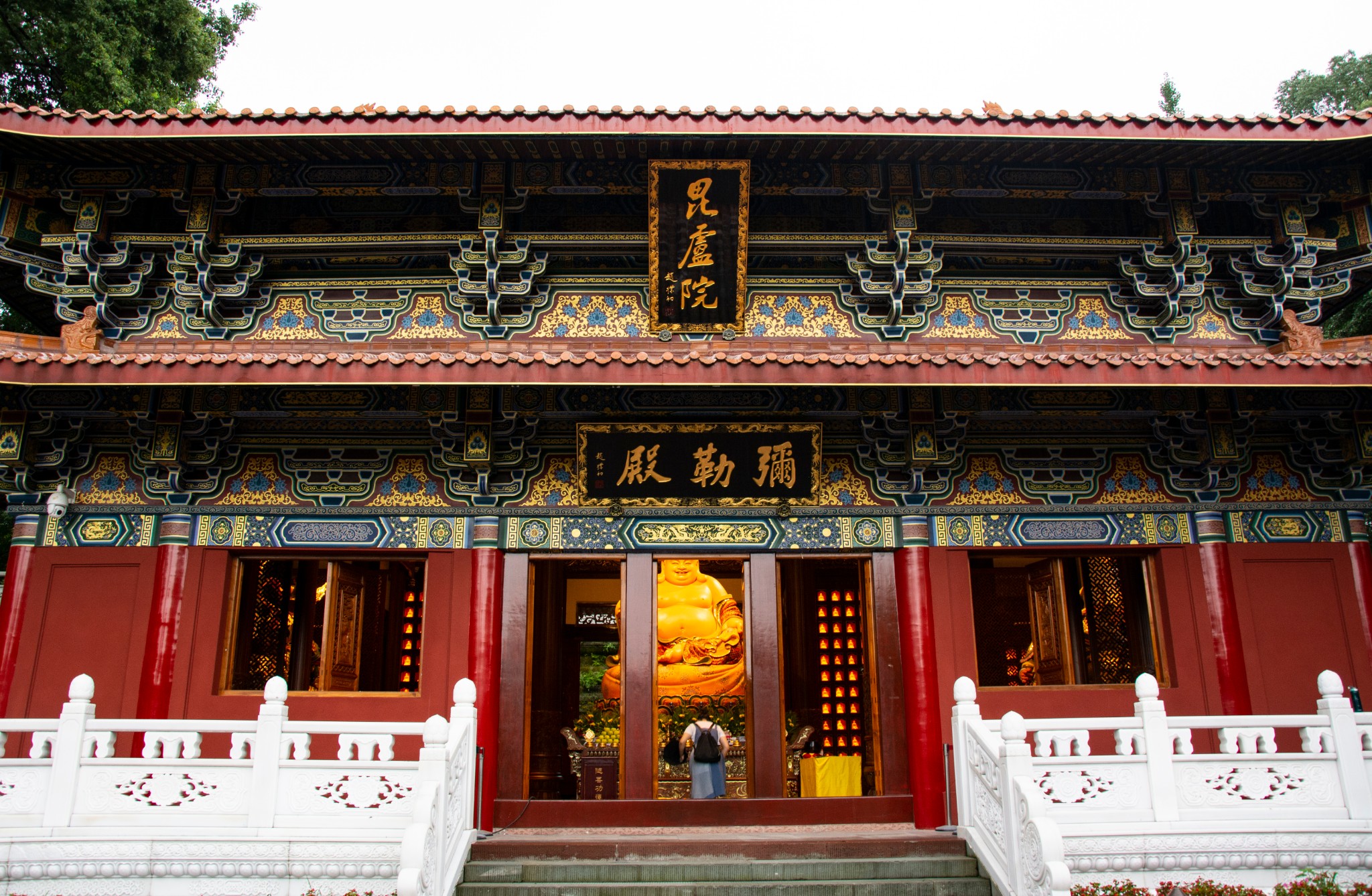 休息过后继续,往里走是一座重修的寺庙——毗卢院,寺新精美,依山层叠,殿前长阶配白玉雕栏,画檐露于古树苍松间,游人大多在大佛处,这里反而人少清幽,隐约还有暮鼓诵经声传来,确实清心之地,正自陶醉,耳边肥妻说了一句“昆卢殿”,突兀间抬头一看,原来是大殿牌匾的书法颇有造诣,肥妻却将繁体的毗和昆傻傻的分不清!唉,没文化真可怕,好在四周无人,我立刻摇头晃脑说:“是毗卢院好不好?怎么会有昆卢呢?你忘了毗卢遮那佛了吗?”肥妻憨笑道:“哦,是喔,主要是牌匾写得难看!”我再细看题匾人更是哑然失笑:“那是赵朴初先生写的好不好,公认的佛界领袖和书法家!”肥妻还是不服说:“就是难看,还没你写得好!”我一听赶紧把她拉走,我是该高兴呢?还是该高兴呢?不,我是怕被人追着打!!