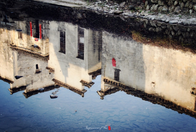 进村的村道没什么人,很安静,只听见蝉鸣。路过一个小水坑,看见建筑的倒影,白墙黑瓦倒映水中,换个角度去看这个世界会有不一样的美。