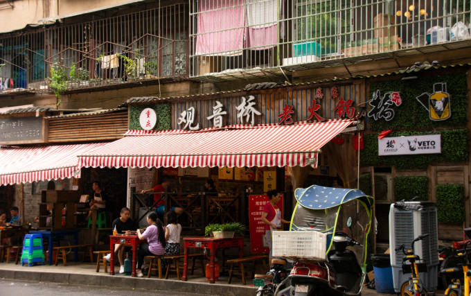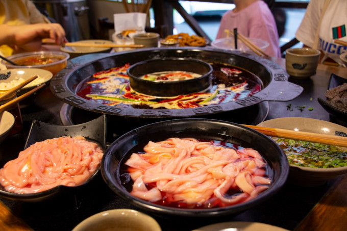 打车来到包家巷,据说这里是成都土著的发源地,30年代成都第一家妇产科医院就在这里,搬迁前有40万成都土著在这里出生,搬迁后原址新建的还是妇儿医院,出生的更多!所谓地道的美食,就是从小到大都爱吃的美食,而地道的味道,就是从娘胎里已在品尝不得不牢牢记住的味道。巷子不长,餐馆林立,来回走了两圈,观音桥火锅战胜了蜀华串串、包家兄弟牛肉店、82号餐馆、小院抄手、乐山黄鸡肉、美蛙鱼头、麻辣烫。。。等所有同行,无火锅,不成都!地道就是地道,食材新鲜、味道适宜,别的地方吃火锅是越吃越辣,这里是越吃越香,而且不用蘸味碟都已鲜香无比,满满一架配菜,吃得我们搓着肚子连声叫好,满足!