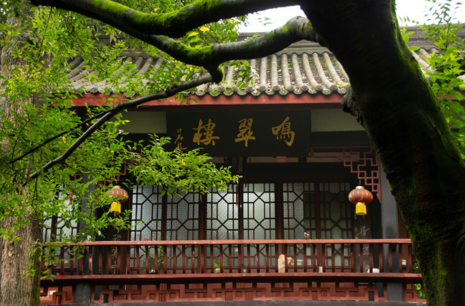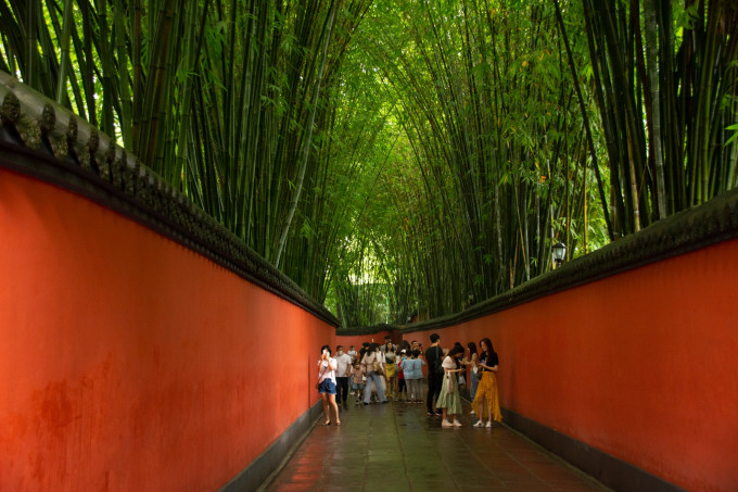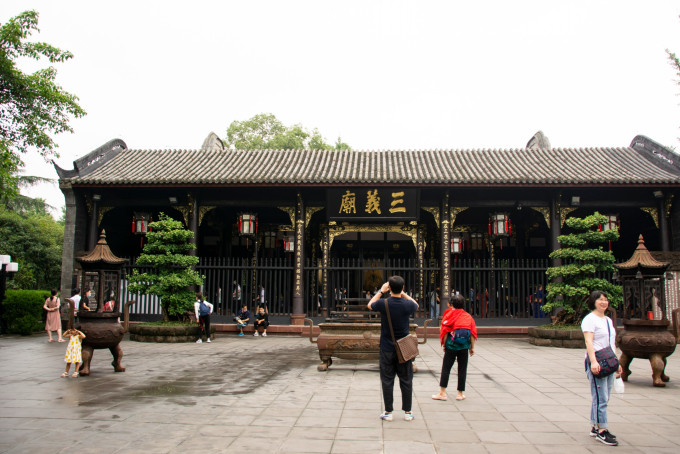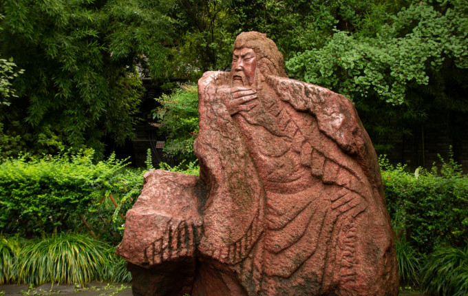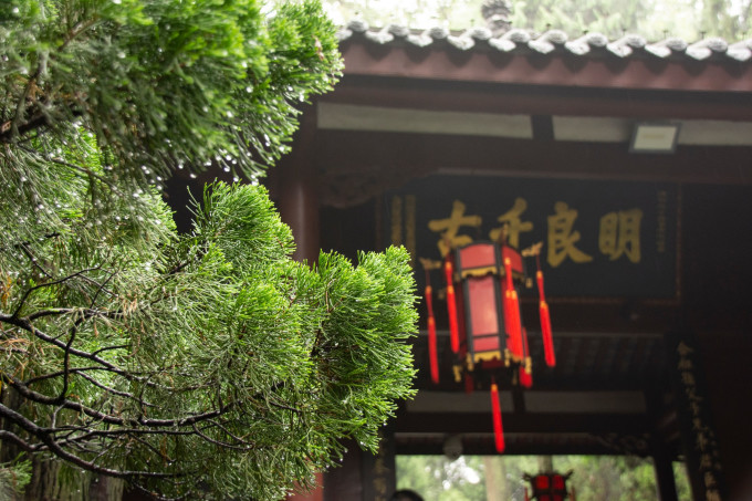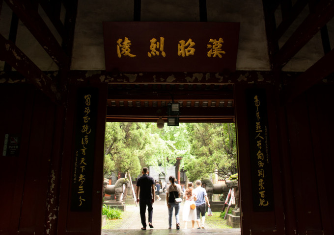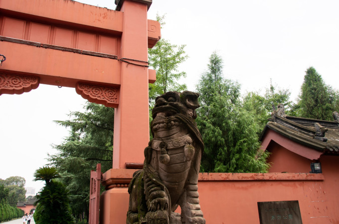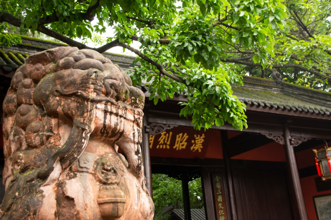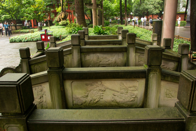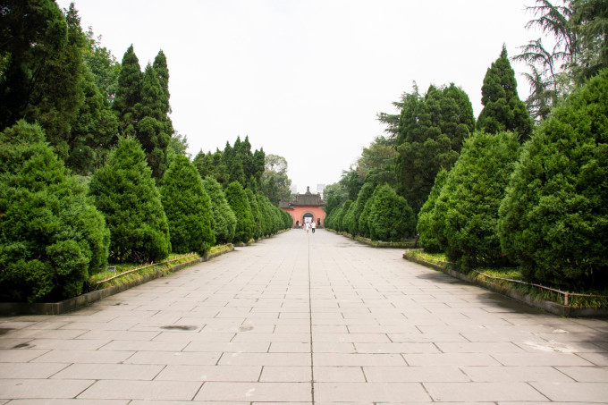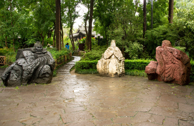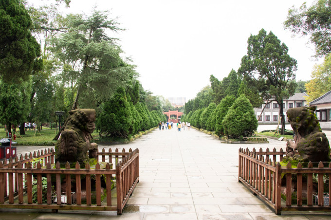 八月一日,阴,武侯祠。武侯祠是吾友诸葛亮之祠,虽是好友,虽是年少时来过两次,但印象已是模糊,肥妻是初来,正好旧地作新游。不过来到门口,我就感到有点不对,本想向肥妻介绍一下吾友之光辉事迹,但脱口而出的却是“丞相祠堂何处寻”,进去后满祠柏树苍翠,脑中弹出的是“锦宫城外柏森森”,见到鲜花盛开想到的是“花重锦宫城”,连看到一块大石头都会说“江流石不转”,思绪混乱,只好拉着肥妻往里走,在文臣武将廊欣赏名人雕塑,肥妻对三国不熟,其实那二十八人我也不太熟,只能挑我知道的说,比如:将军向宠,性行淑均,晓畅军事,试用于昔日。。。咦,怎么从诗词变成《出师表》呢?就记住那么几句,一下子全跑出来了,只好让肥妻自己看人物简介。转去惠陵途中有几个小孩在追逐打闹,我连忙躲开,脑海自然而然的出现“亲贤臣,远小人”。