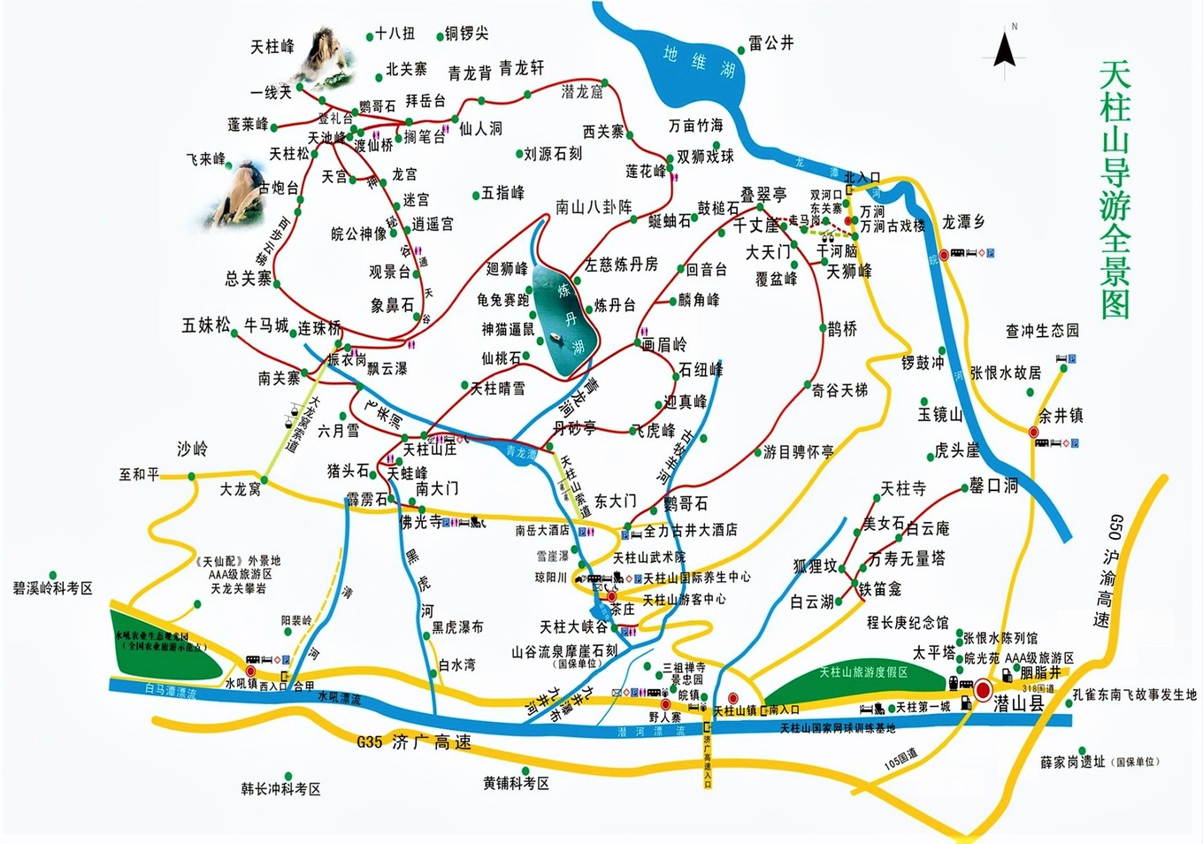 天柱山又名潜山、古南岳、皖公山(安徽省简称“皖”由此而来),位于安徽省安庆市潜山市境内。公元前106年,汉武帝刘彻登临封号南岳,后隋文帝改为衡山,天柱山因此称古南岳。天柱山名列安徽省三大名山(黄山、九华山、天柱山)之一,集黄山之奇,华山之险,峨眉之秀于一体,也有人称其为小黄山。天柱山主峰(天柱峰)海拔1488.4米,如“擎天一柱”而得名,被誉为“江淮第一山”。雄峰、奇石、秀水、幽洞,被誉为天柱山“四绝”。