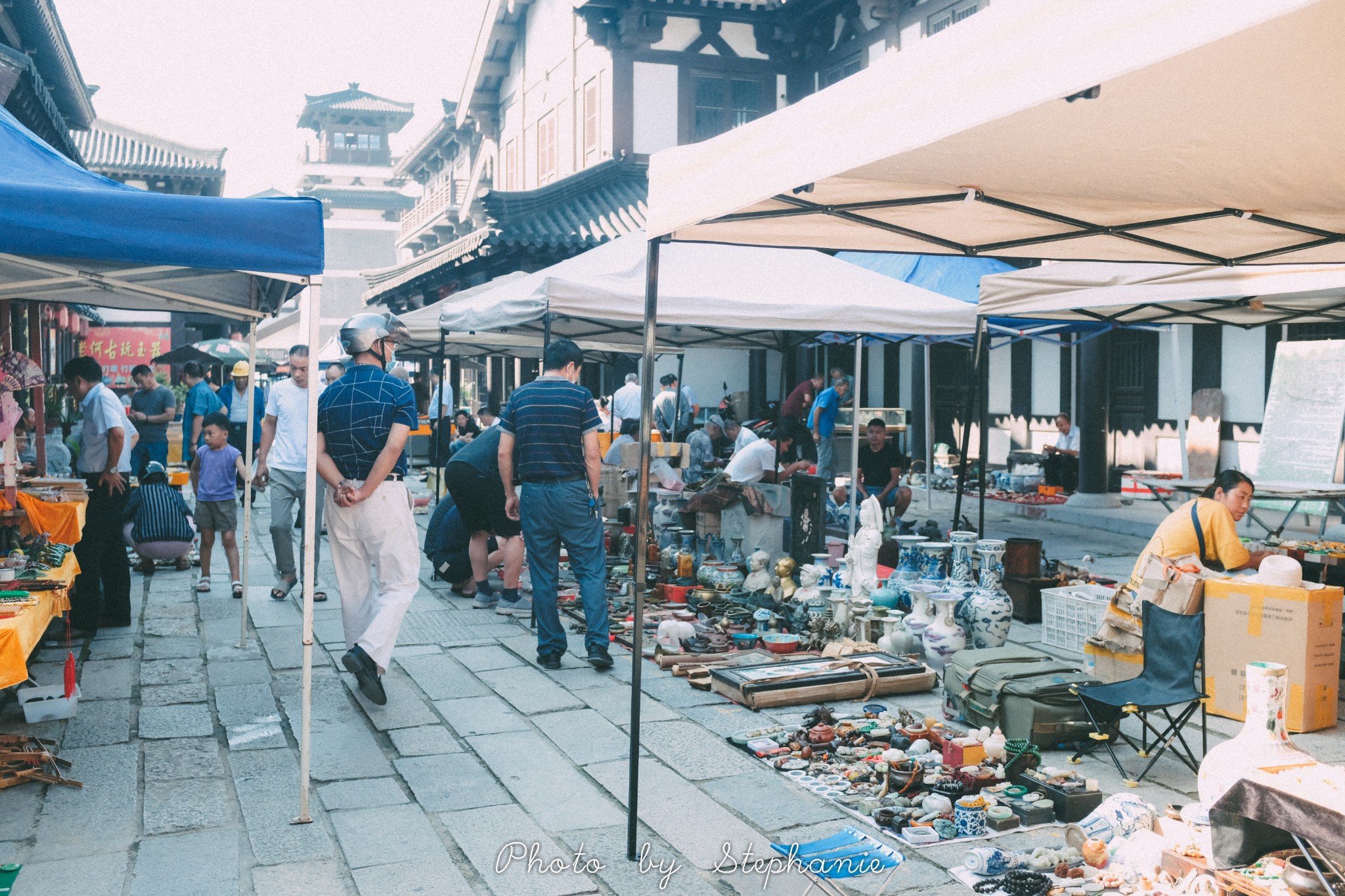 在项王故里外有一个西楚古玩城,一大清早就有不少摊位出来摆摊了,怀旧又不乏市井气息,识货的人或许能在这里淘到一些中意的老物件。