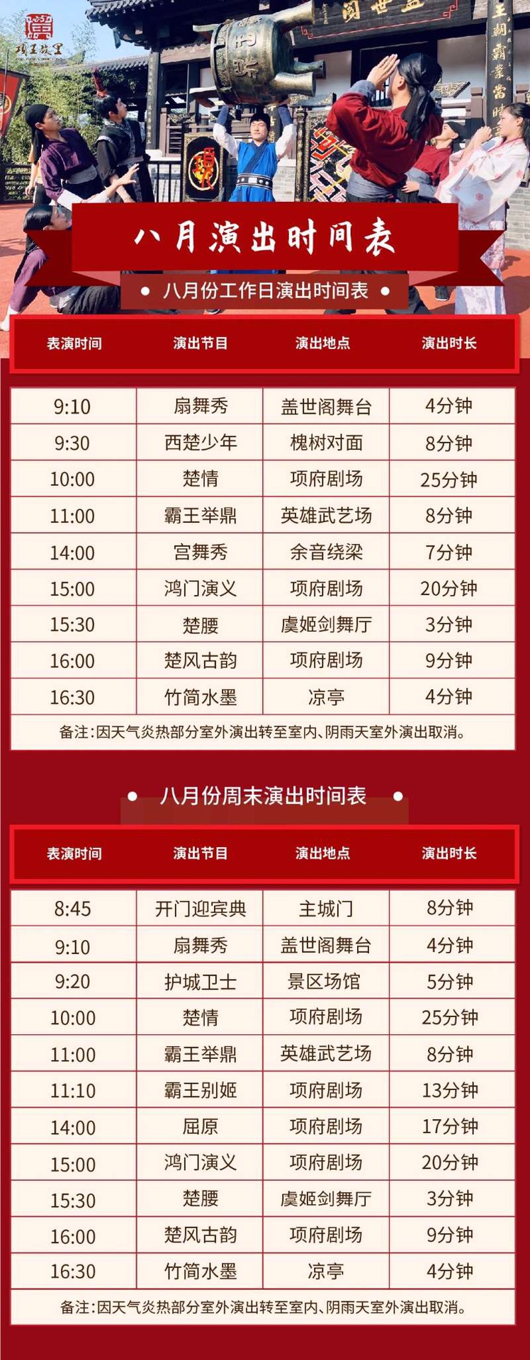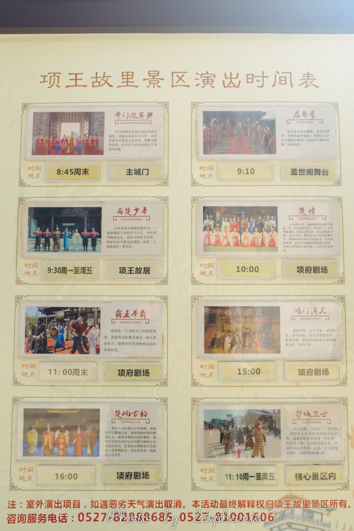 我询问了工作人员,景区里比较有名的表演是上午的《楚情》和下午的《鸿门演义》,虽然《霸王别姬》在历史上很有名,但是景区内的表演是京剧形式的,在那个时代并不存在京剧,所以不做为主推项目。