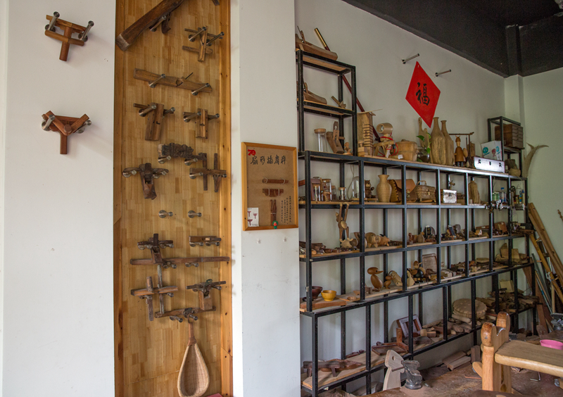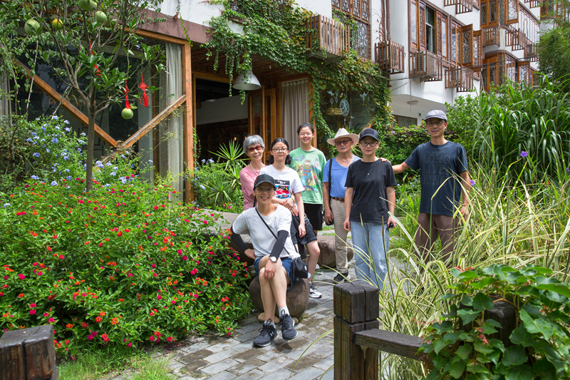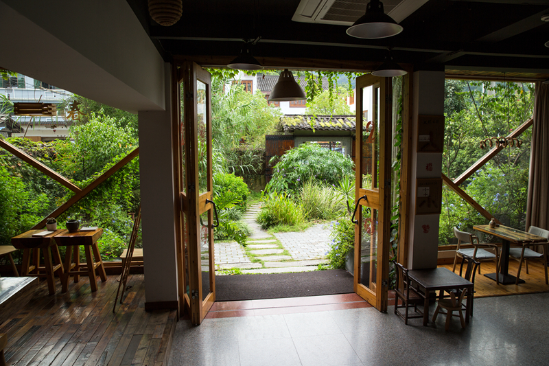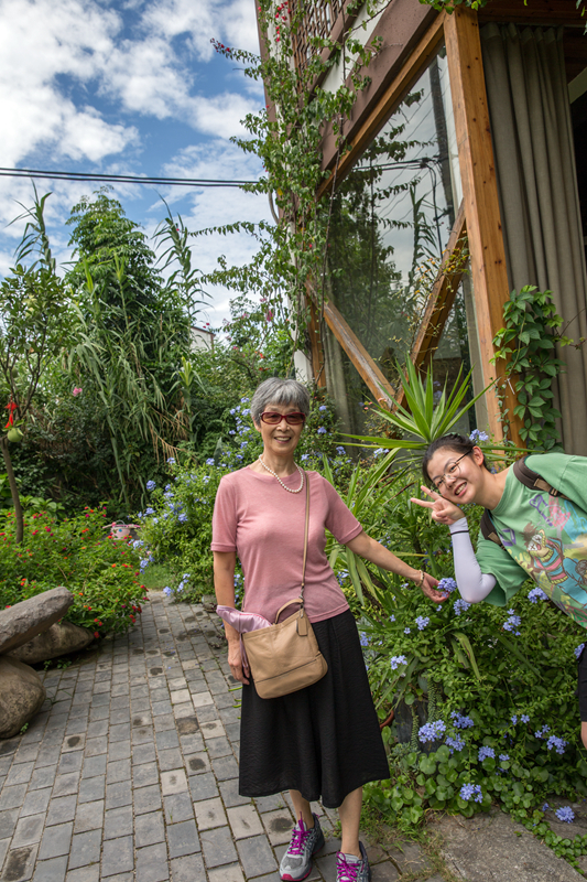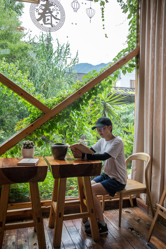 民宿是自用房改建的,整洁素净。木匠出身的房东特意在门厅里做了一面巨大的木格子书墙,琳琅满目的书册里有不少是关于木工技艺的。阳光从玻璃窗外的院子进来,有蓝雪花和五色菊的影子,花色与书香给这家普通的民宿增添了雅致的格调。