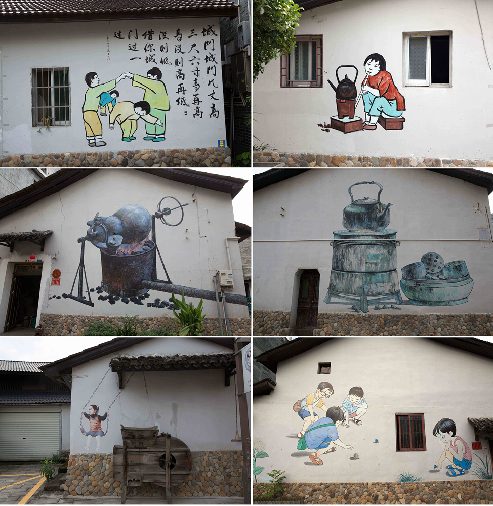 ▼▼▼通向景区入口的老街,墙上的涂鸦是有关乡愁的,那些近乎“古老”的游戏和传统的物具,总能瞬间忆起当年的情境,心底里会情不自禁荡起暖流,笑意慢慢浮起。又因感触时光匆忙,很多东西再也回不来而生出感伤!