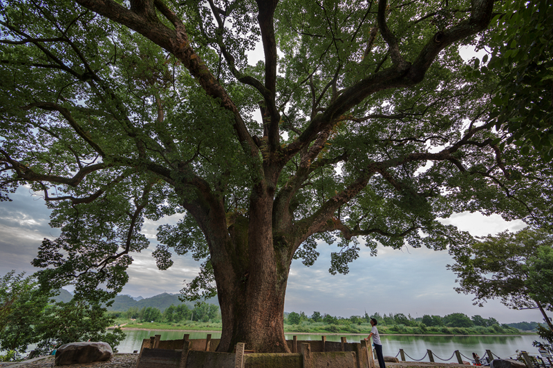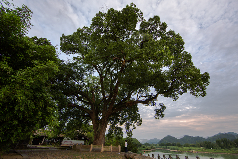 首入眼帘的,是一片浓密苍翠的绿。因气候适宜,水系丰厚,水渠两岸孕育了一片千年古樟林,遒劲有力的枝干伸展天空,繁茂的枝叶覆盖了河渠两岸,即便在盛夏的午时也能感受到一份温润的清凉。与之相比对是的,在画乡景区入口也有一颗古樟,其树龄更是高达1300年,展开的冠幅堪比半个足球场。