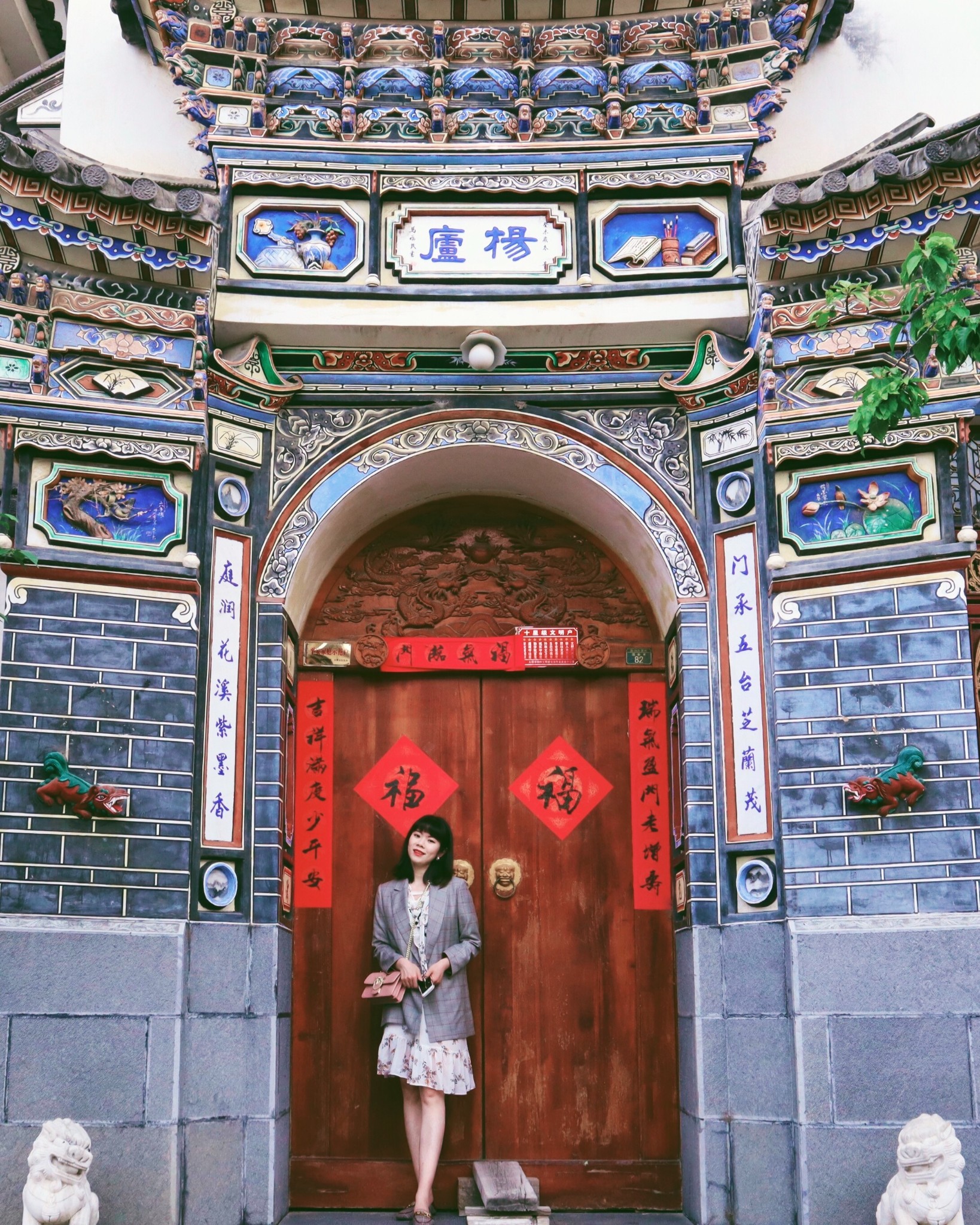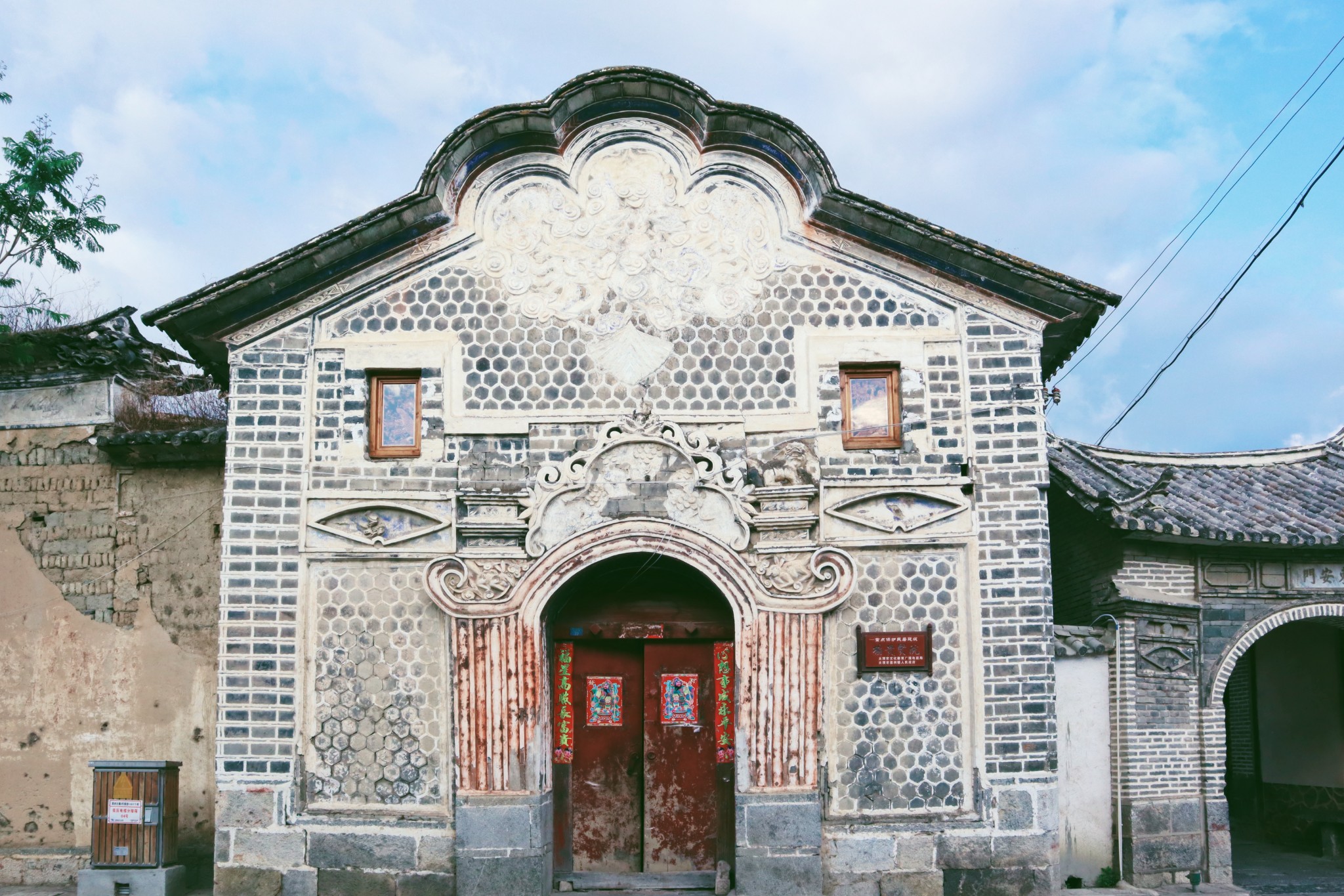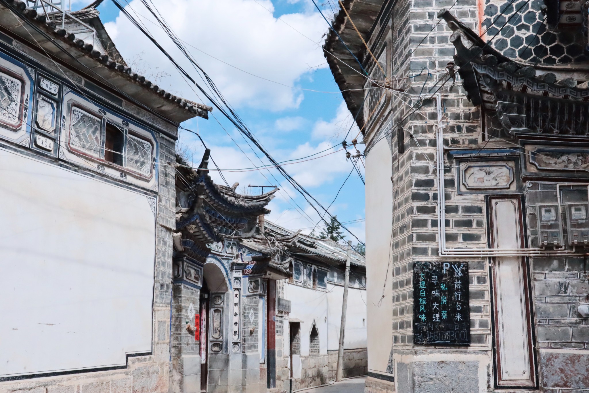 在喜洲,当我们触碰着这些白族建筑,可以感受到它们独特的民族美。典型的特点是院落门头上繁复的翘角飞檐,和样式统一的高大木门。