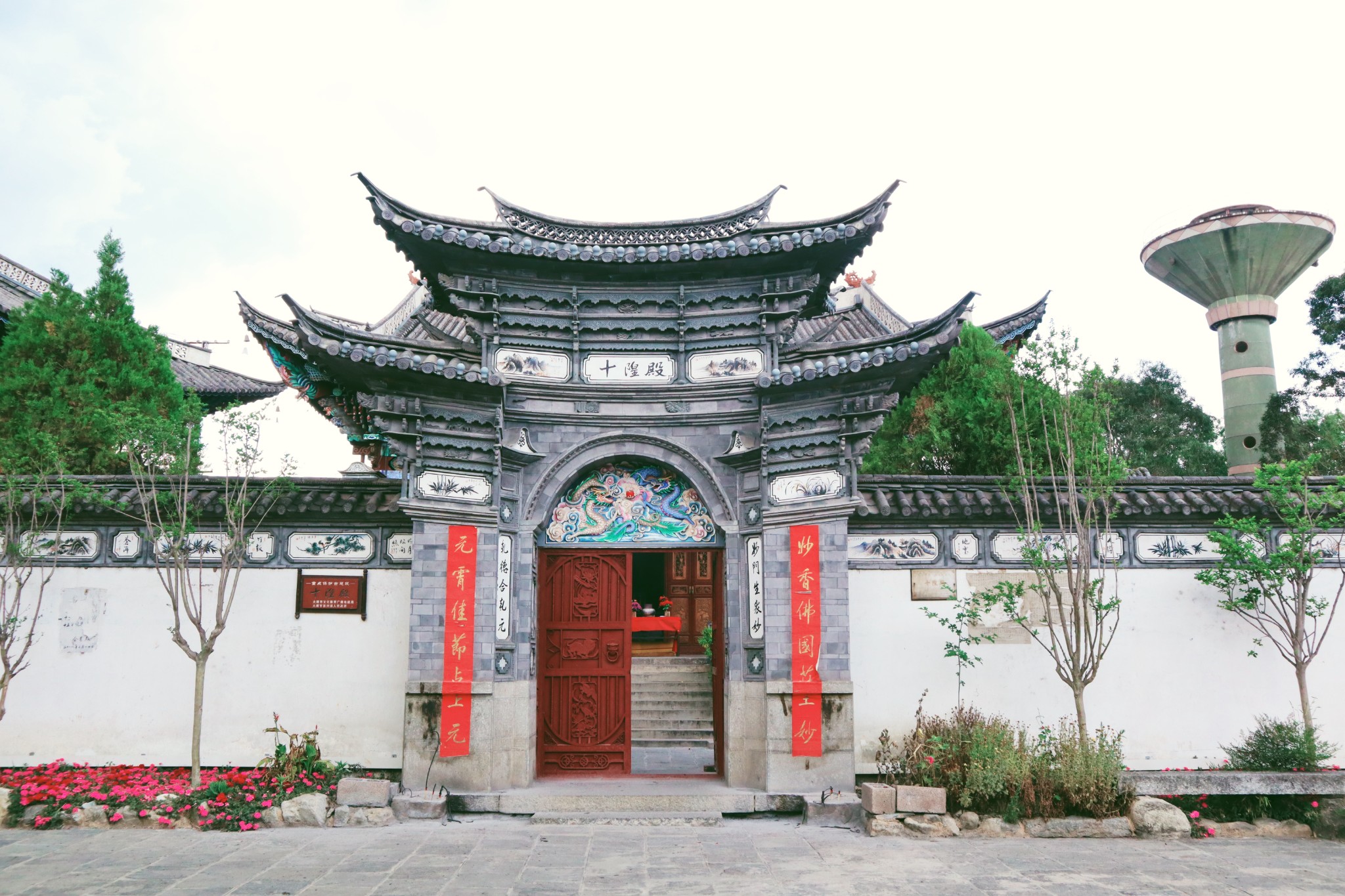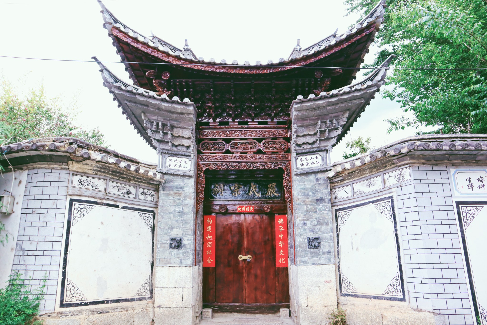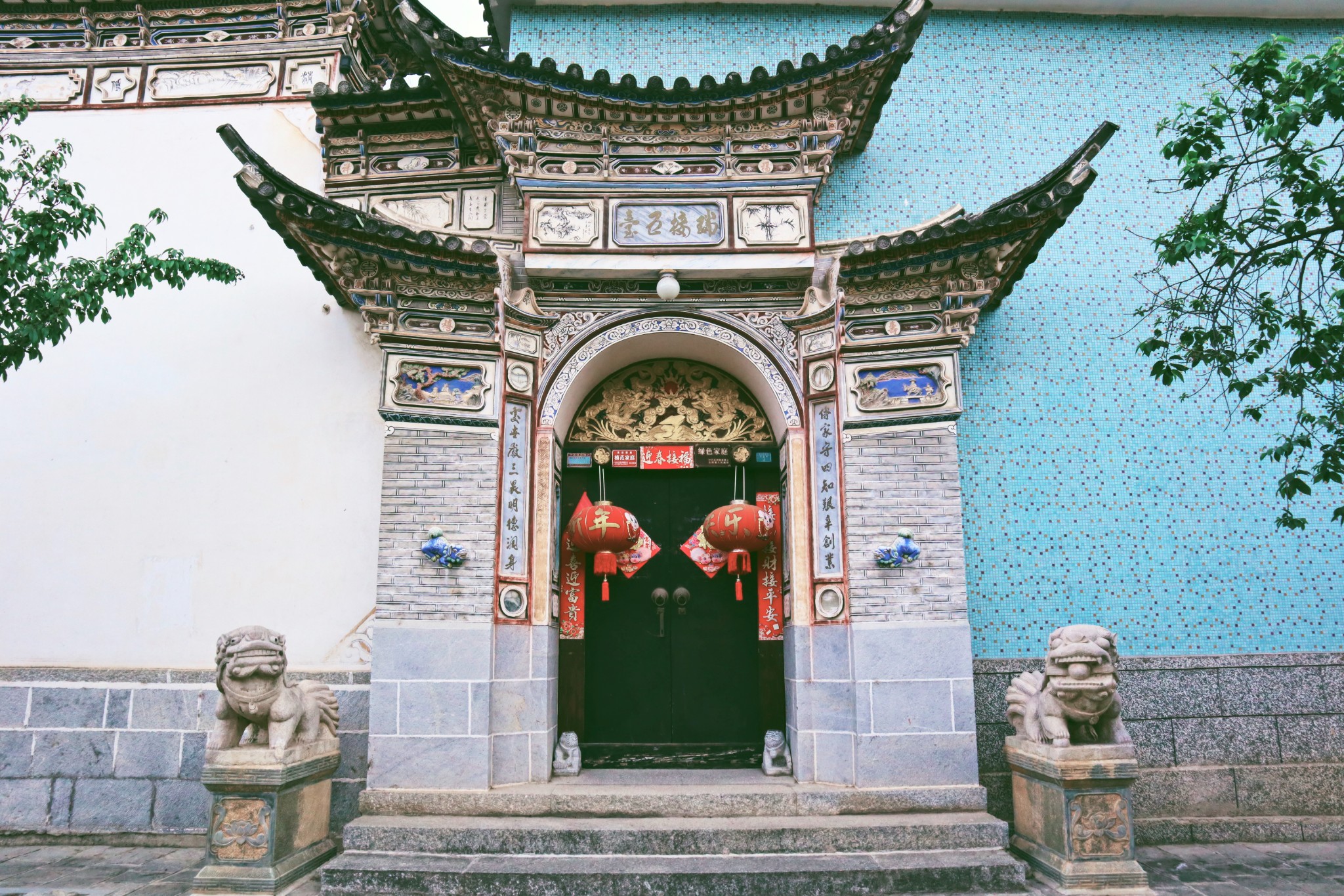 在喜洲,当我们触碰着这些白族建筑,可以感受到它们独特的民族美。典型的特点是院落门头上繁复的翘角飞檐,和样式统一的高大木门。