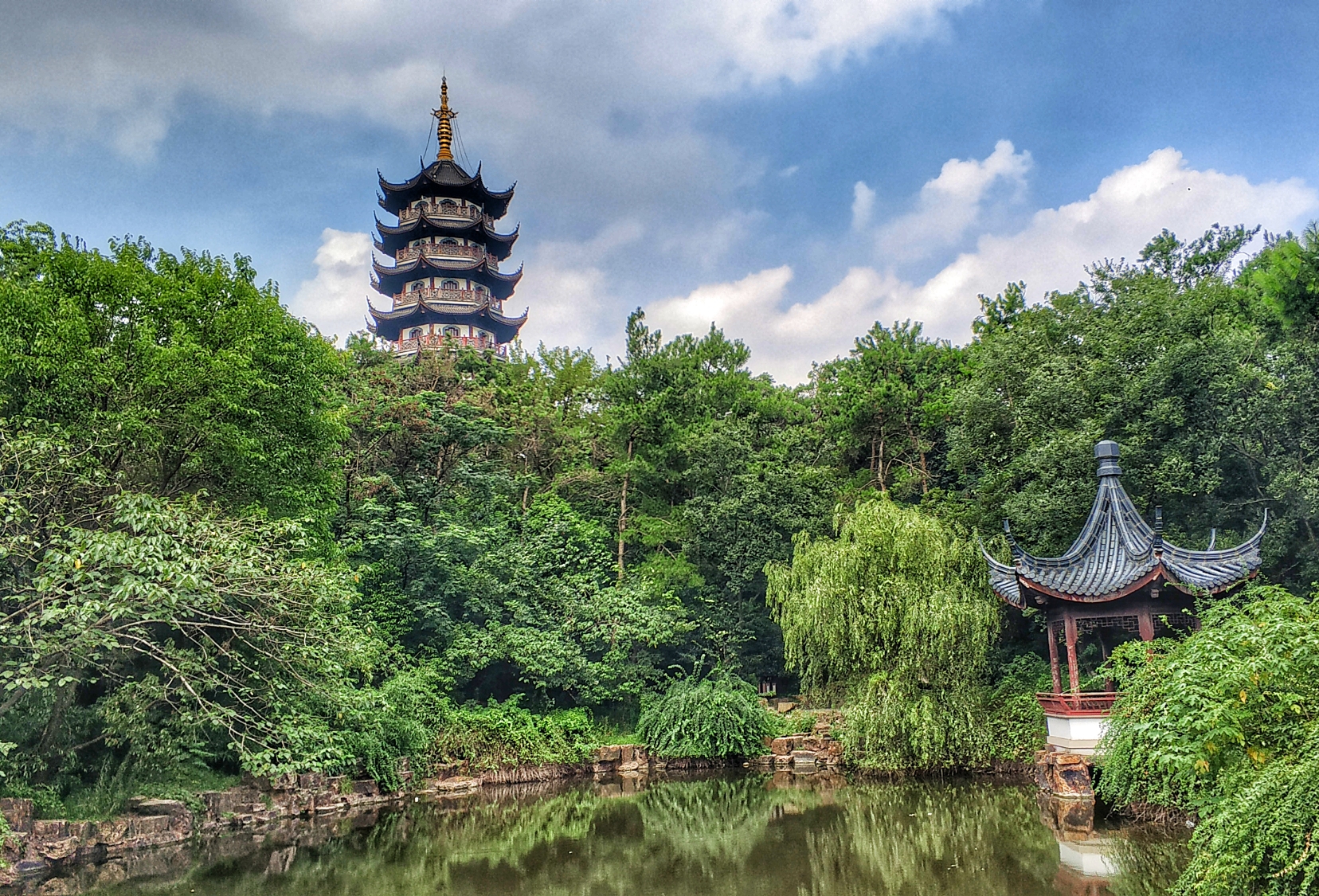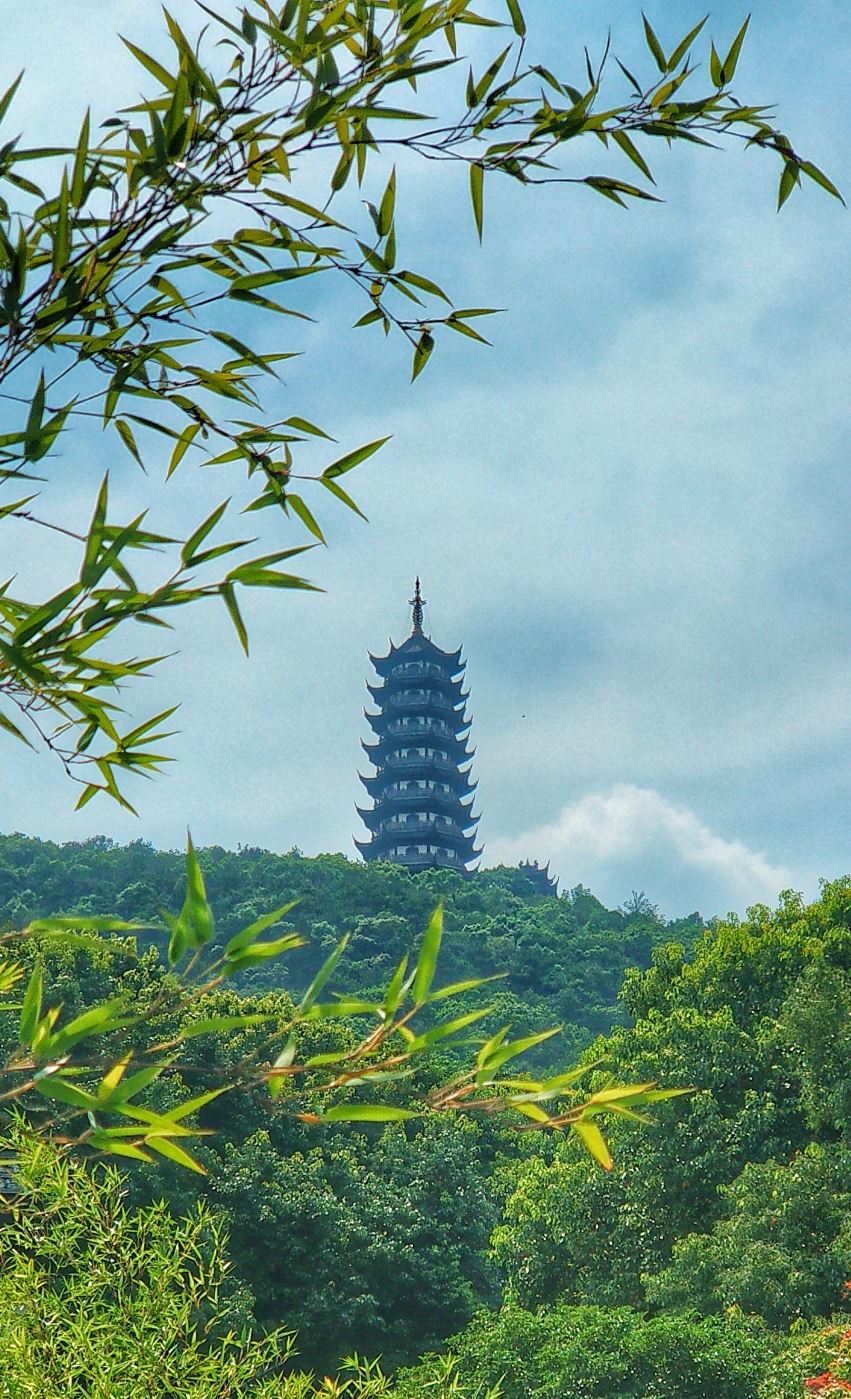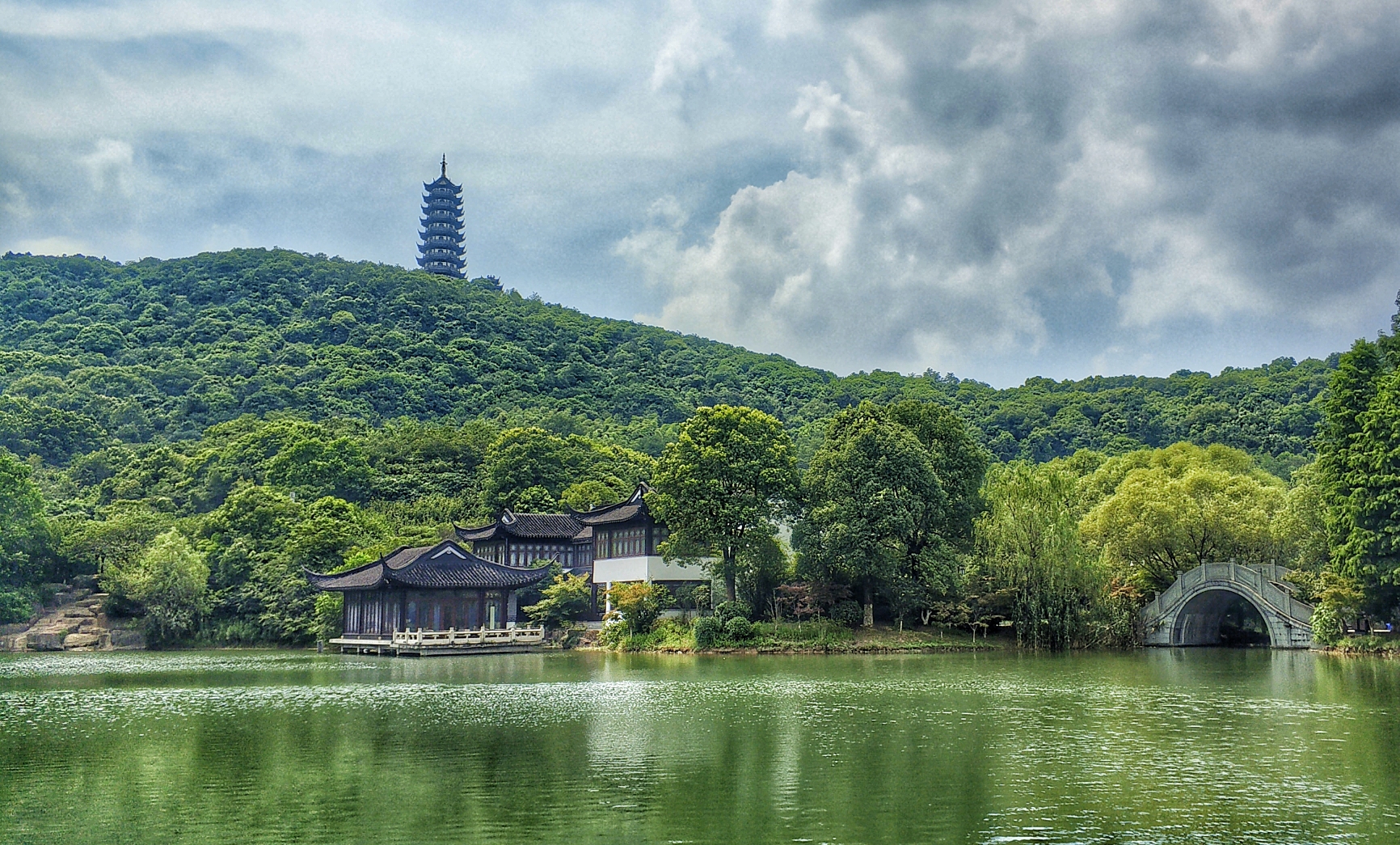 塔耸湖畔清,桥拱诗意浓,