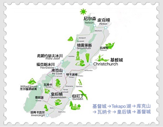 不过12月新西兰的一场大暴雨冲毁了西面的公路,据说修路要1个半月,我们还是挺担心他们修不完,所以改成了中线往返↓这样的话时间也能充裕些。