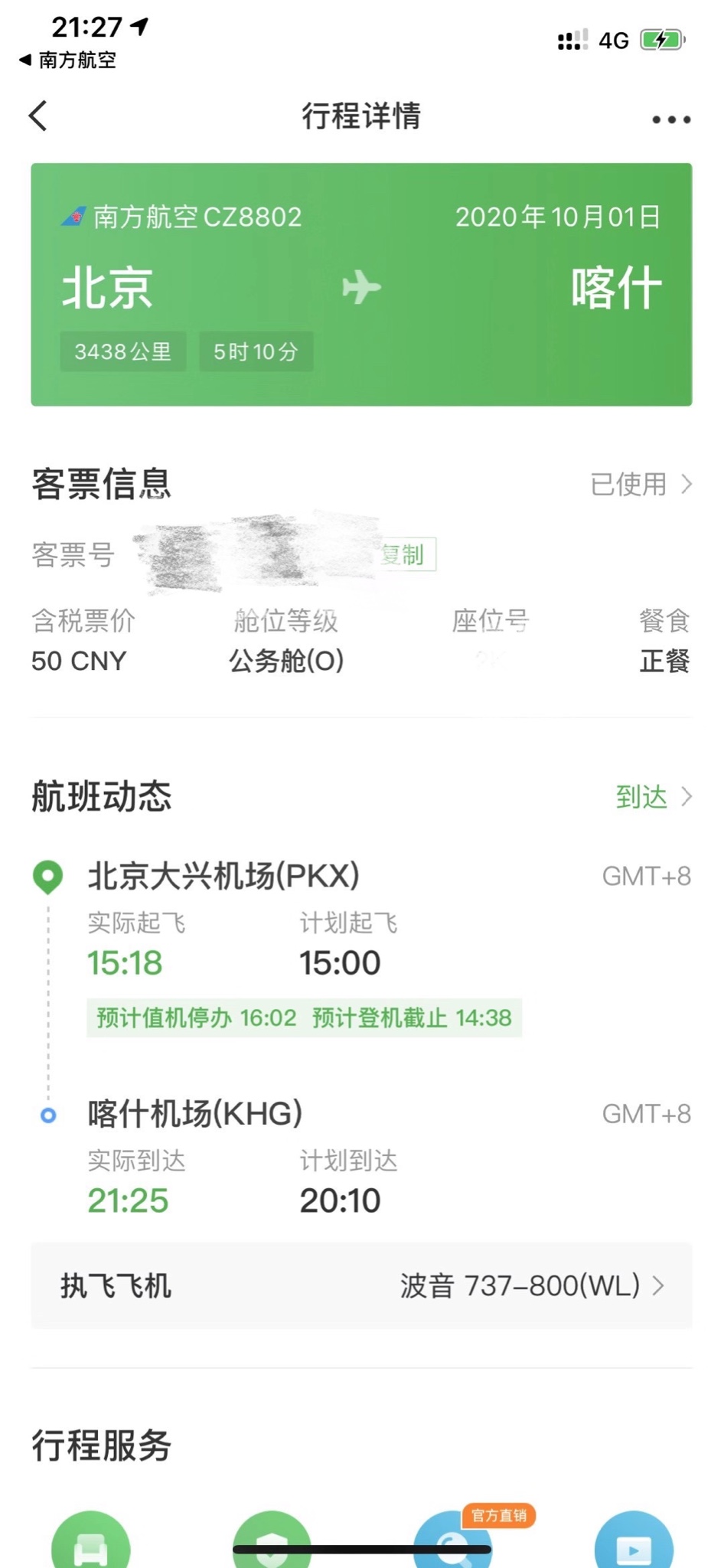 买了南航快乐飞,一直都没有飞其他的地方,就是为了提前先把北京往返新疆的两个最贵的大交通cover住。喀什-北京的直飞航线,是南航第一个直飞疆内支线的航线,2020年10月1日也是它的首次飞行,5个小时10分钟的时长应该是创下了国内直飞航线的最长记录,而且因为是首航,所以机组也很谨慎,刚登机就提示大家这次飞机会多飞一个多小时到达,最后实际飞行了6个小时7分钟。