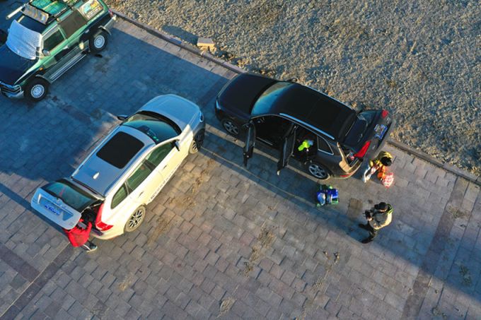 无人机返回时描准了昨晚搭建帐篷的地方,三位美女在准备自加热早餐。在戈壁滩无人区睡帐篷吃自加热早餐,这种旅游体验难得一遇,现在想起也有点小得意。