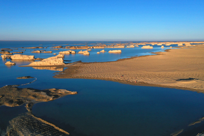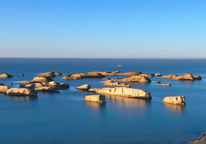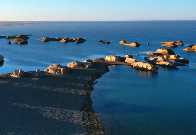 矗立在湛蓝湖水中的雅丹好像也变得兴奋起来,将自己亮丽身影毫不吝啬地投向湖面,一时波光倒影,静谧至美,刚哥兴奋的叫邵帅赶快放飞无人机。