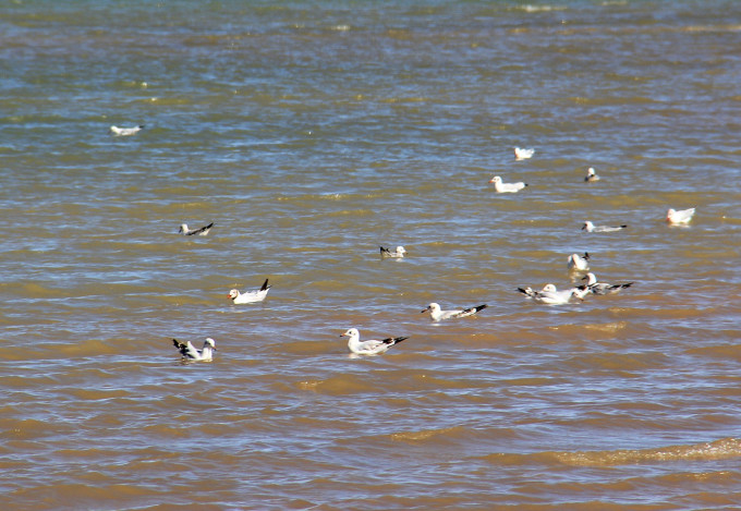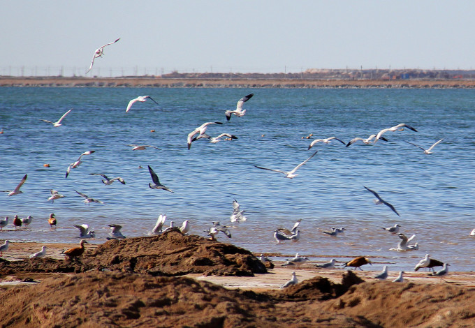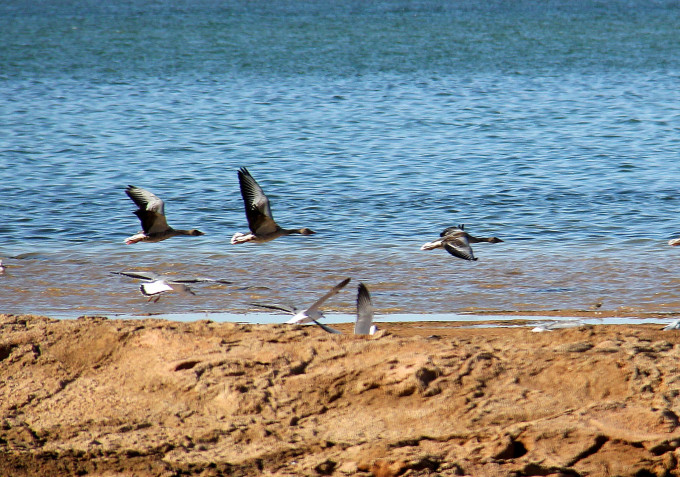 后来,刚哥和邵帅像电视中鬼子进庄一样,蹑手蹑脚地先靠近湖边的一座小土堆,再悄悄地突然起身,终于抓拍到西台吉乃尔湖水鸟嬉戏觅食的倩影。