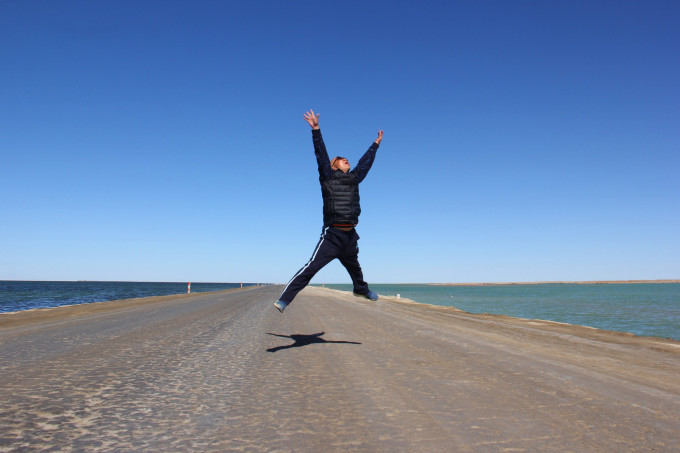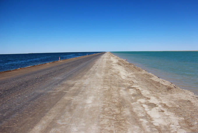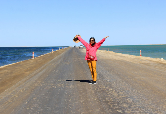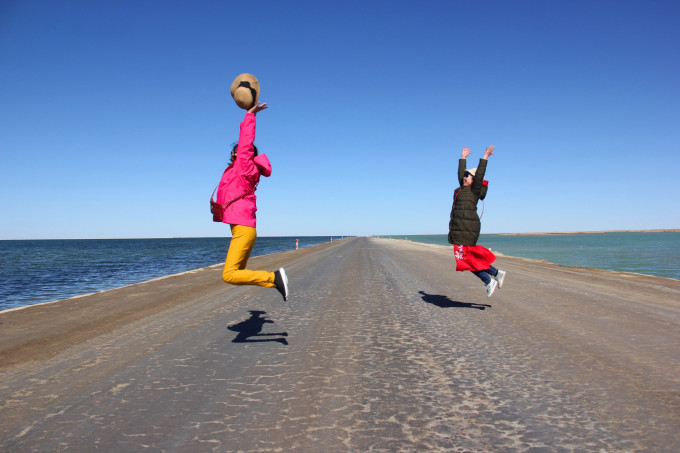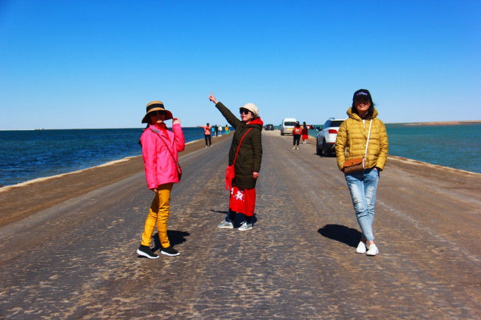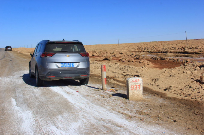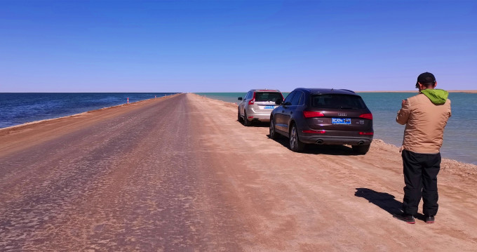 离开水上雅丹,沿着G315国道西行36公里到达西台吉乃尔湖。平整的陆上柏油公路变成了水中的搓衣板盐碱土路,是目前到达西台吉乃尔湖的明显标志。
