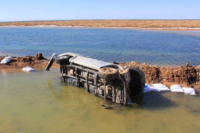 在西台吉乃尔湖区看见一起车祸,让我们万分紧张,大家立即下车察看。两个出事车辆上都没有人,车辆撞击产生的碎屑撒了一地。琼字牌照的车停在路边,左侧头部撞击损坏严重;另一辆皮卡车侧翻于西面大湖中。估计还是行车速度太快造成的,活生生地一堂安全教育课呀!