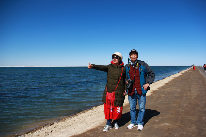 旅游的人一般会在西台吉乃尔湖的土路上停留观景。好在现在车不多,还比较安全。摆拍的、蹦跳的、秀恩爱的、放飞无人机的...人们在土路上欣喜若狂,欢笑时光,何尝不是西台吉乃尔湖上的一道风景线。
