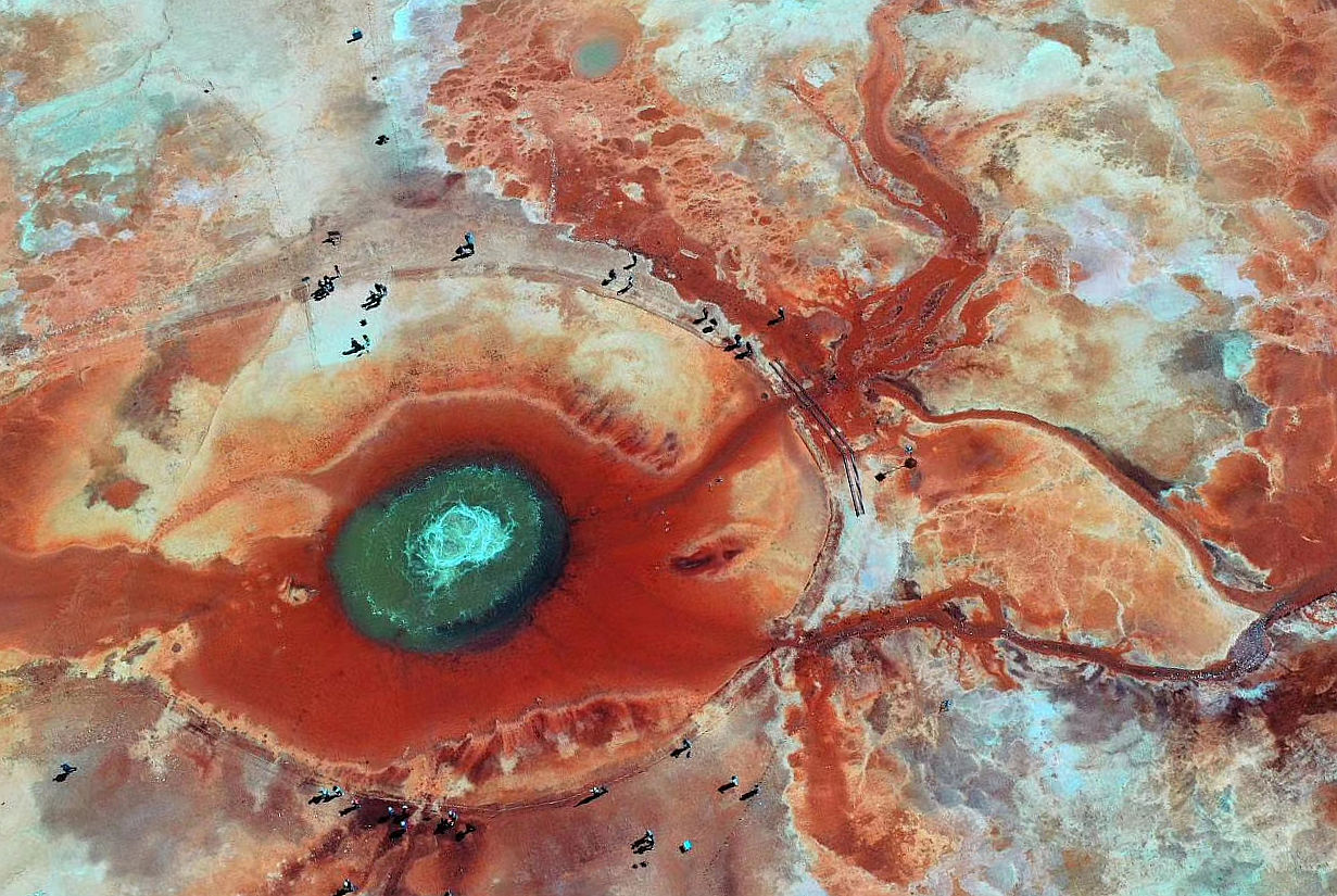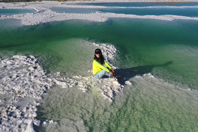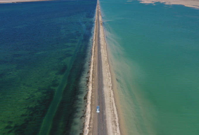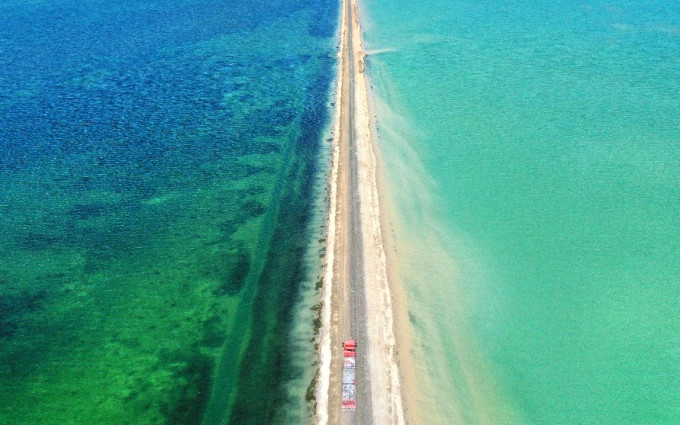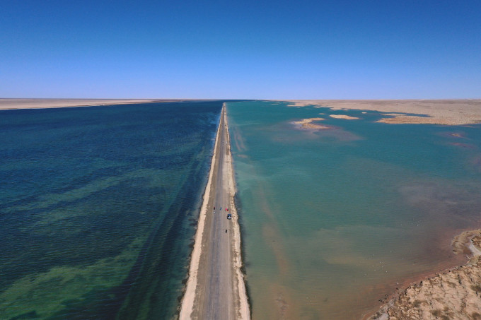 从高空往下看,湖水之中穿过一条黄褐色的盐碱土路,土路东西两边水色截然不同。东面幽蓝西面碧绿,就像画家手中的一块调色板。原来,东侧小湖铜离子含量较多,湖水朦胧绿如翡翠;西侧大湖含盐量高,在蓝天的映衬下湖水幽蓝,水天一色。