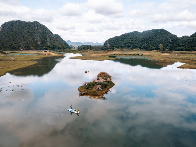 在喀斯特地貌下的漫天荷叶中,划一叶扁舟宛如飘荡在云里,还遇到了群山峻岭之中最具特色的壮族部落。