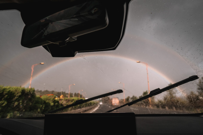 在道路上飞驰,窗外的树木不断划过,唯有洱海的一直在陪伴我们。下午时分,稀稀拉拉的下起了雨。雨停后,太阳照在洱海上,水面的粼粼波光非常漂亮,而前方的道路,竟然挂着一道弯弯的彩虹桥!!