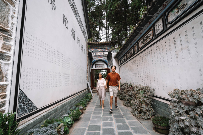 我们的车只能开到感通寺的门口,要下车走上去。到了寂照庵,庵门是具有白族特色的“三滴水”大门。进去之后,发现寺庙不大,却装了整个世界。