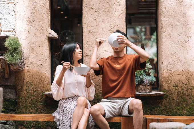 我们还在这里吃到了白族当地特色的斋饭和茶水,20元一份管饱但不能浪费,我们按照自己的食量把素食都装进碗里,找了一个地方开心的吃起来,味道还真不错。