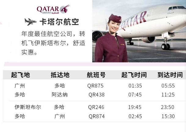 国际航班参考:QR244 SAW DOH 1930 2340 飞行时间:约4小时10分钟