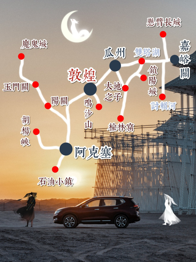 一片金色的沙丘接棒乌黑的山峦向远方延展,沙丘之下绿意隐现,敦煌到了。在这片广袤的荒漠中,诞生了世界级的宗教文化圣地,并一度成为世界四大古文明的汇流中心。这里也开启了我们的飞天寻影之旅……我们用5天时间,踏足神秘的河西走廊,驾驶着2021款奇骏,远离城市喧嚣,驰骋无人秘境,解锁自然密码。这条路,被包裹在历史的浓雾中,许多人,只是依稀知道,这是条著名的路,是丝绸之路上的必经之路。