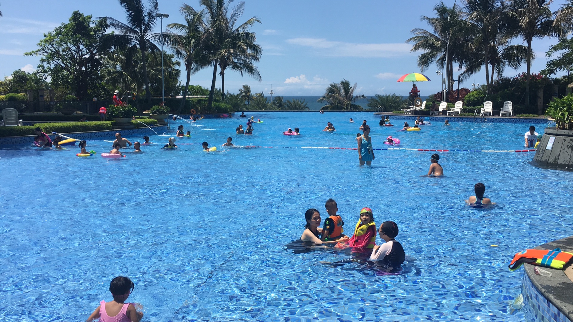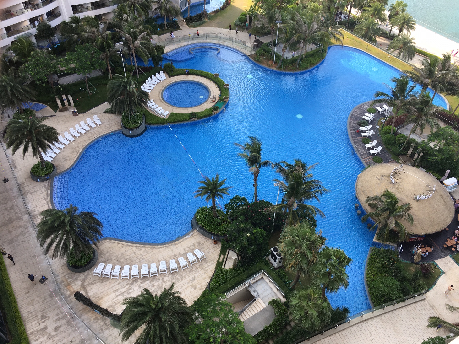 今日睡到自然醒,拉开窗帘,在阳台上对着大海享受着晨风,比在室内吹空调舒服多了。泳池的水纹在海风中慢悠悠晃动,显得格外美丽,远处海滩上,人们早已忍不住要跟大海拥抱,散步的散步,戏水的戏水,出海的出海。