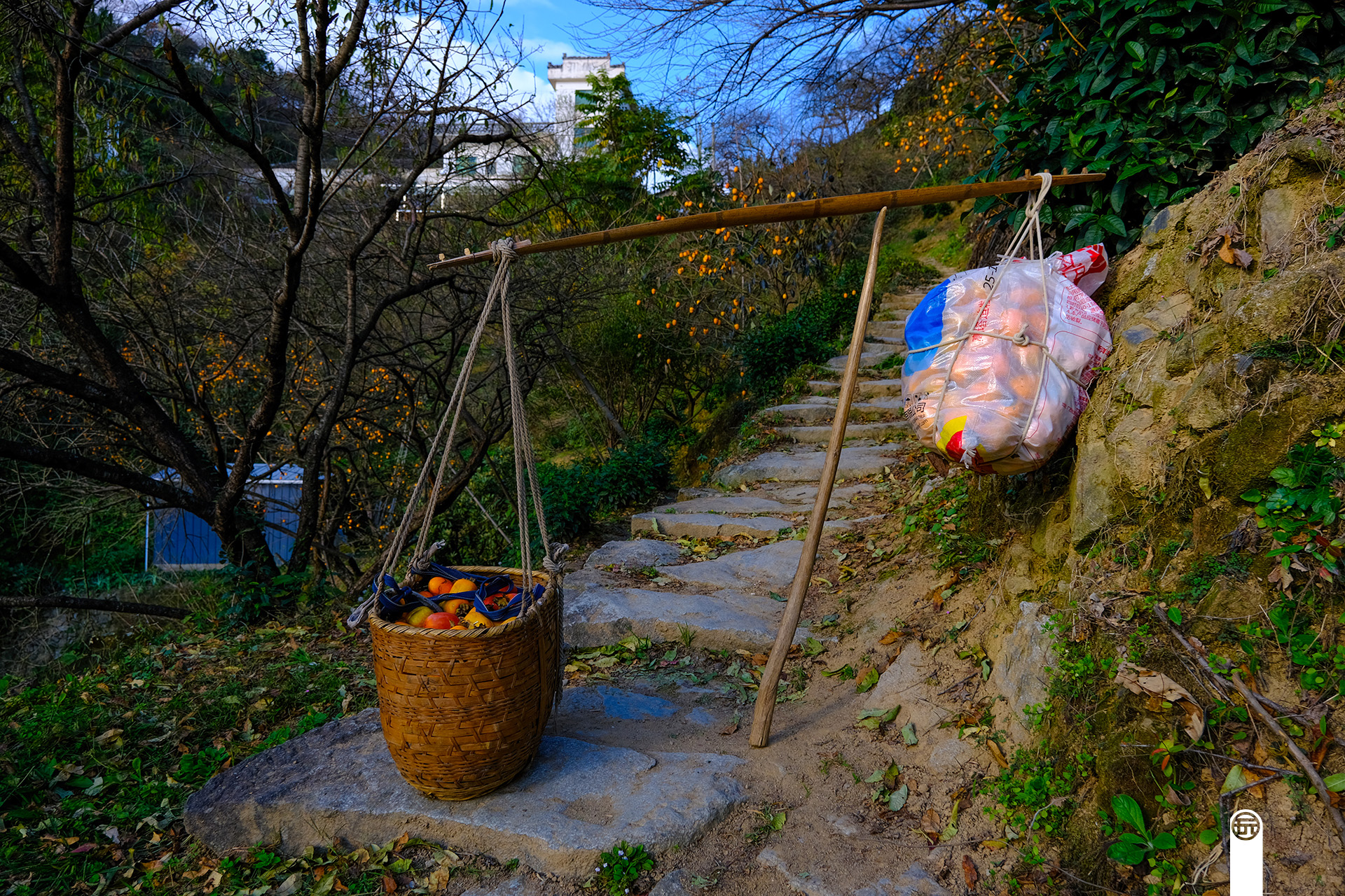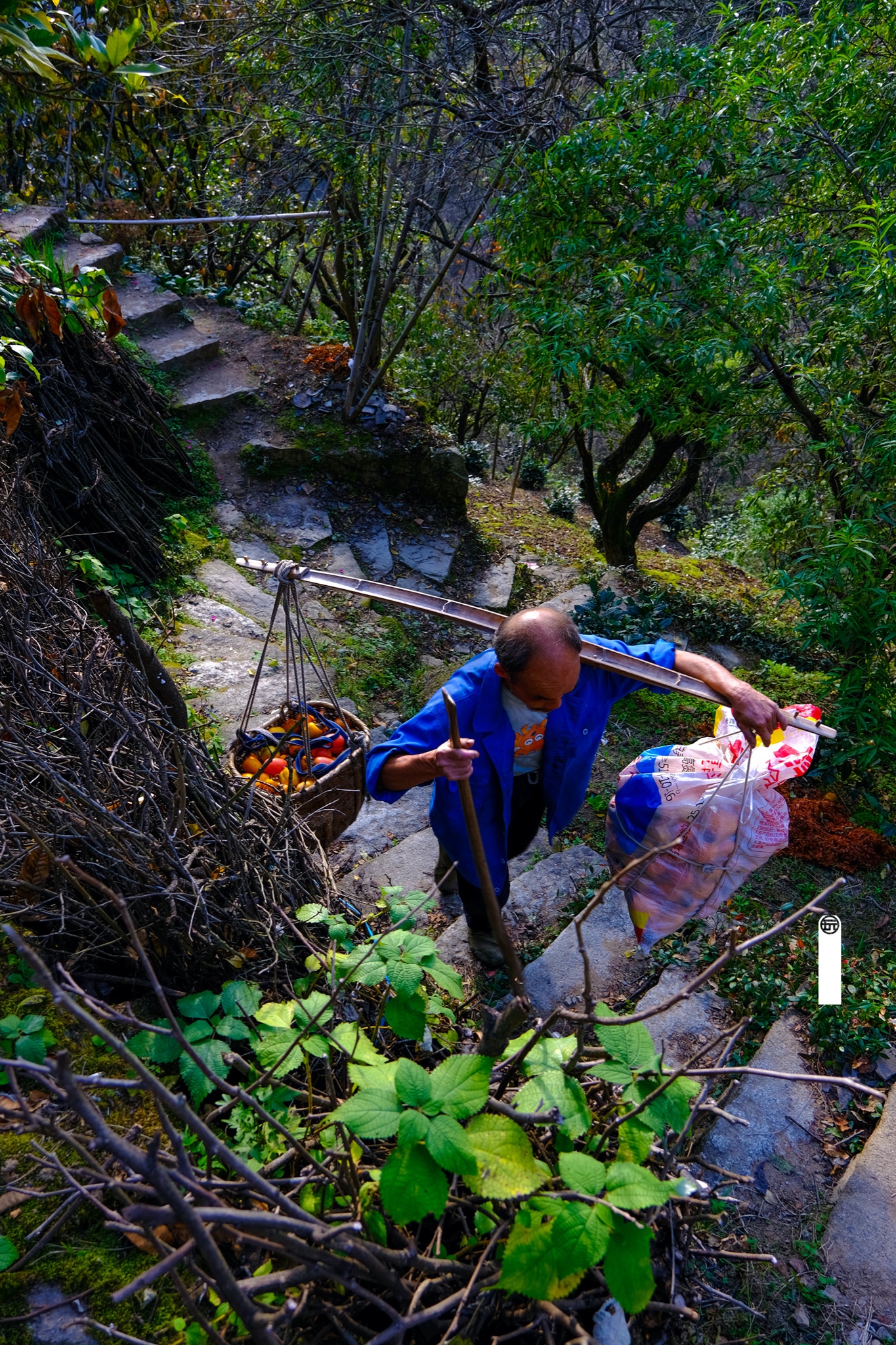看到挑担子送柿子饼的大叔,我想起了黄山上的挑山工,这真是劳动人民最平凡的生活写照。