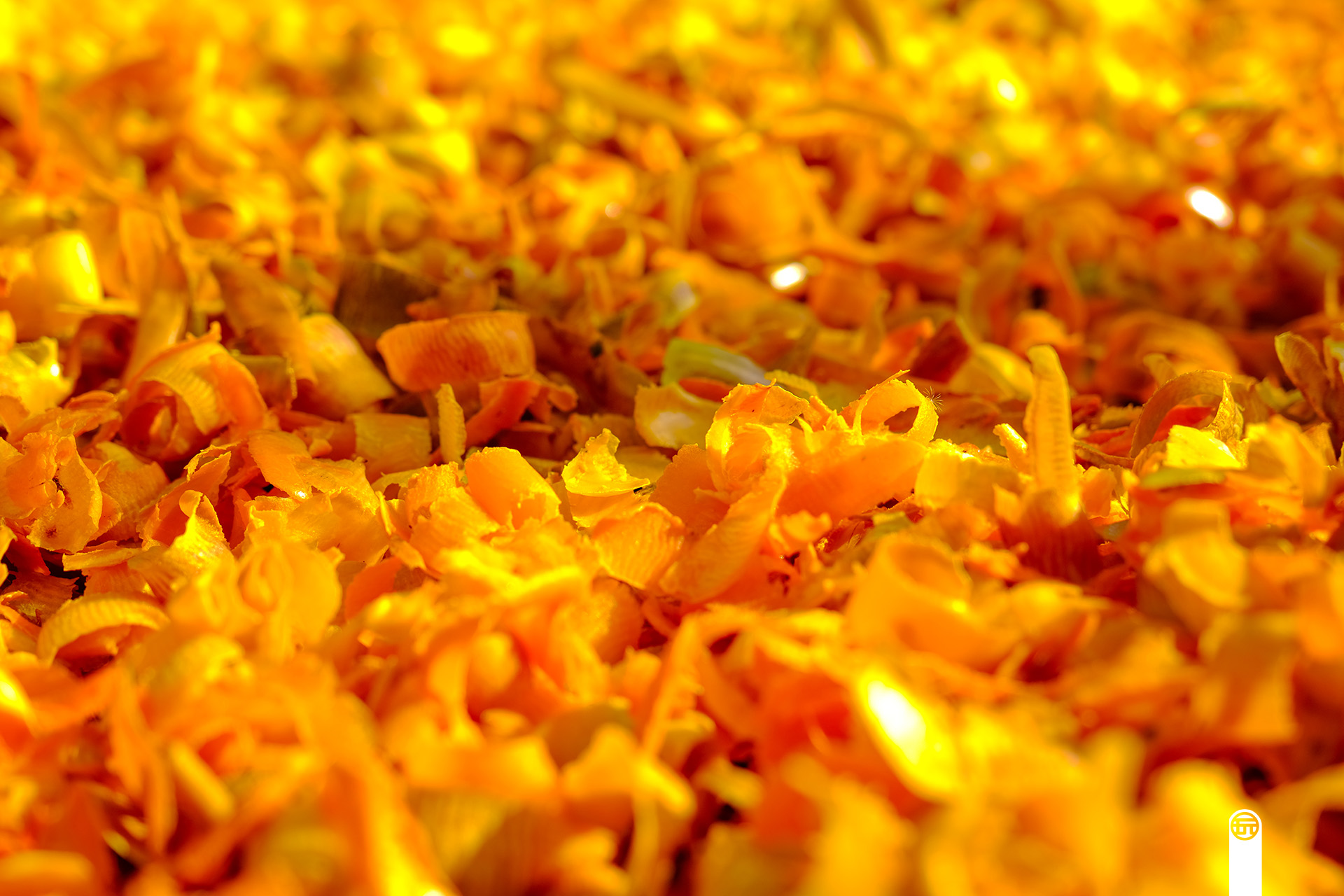 这金灿灿的就是柿子刨下来的皮。有人说刨下来的皮有啥用,不扔了吗?要是扔了,你就大错特错了。我们吃的柿子饼都有一层白色的霜,这层霜就是通过柿子皮捂出来的哦!